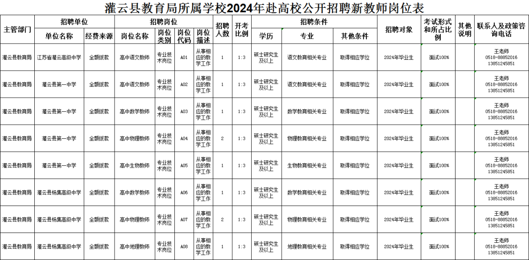 具体岗位及各岗位招聘条件等详见《灌云县教育局所属学校2024年赴高校公开招聘新教师岗位表》(附件1,以下简称《岗位表》)。《岗位表》可在灌云县人民政府网(http://www.guanyun.gov.cn/)查询、下载。