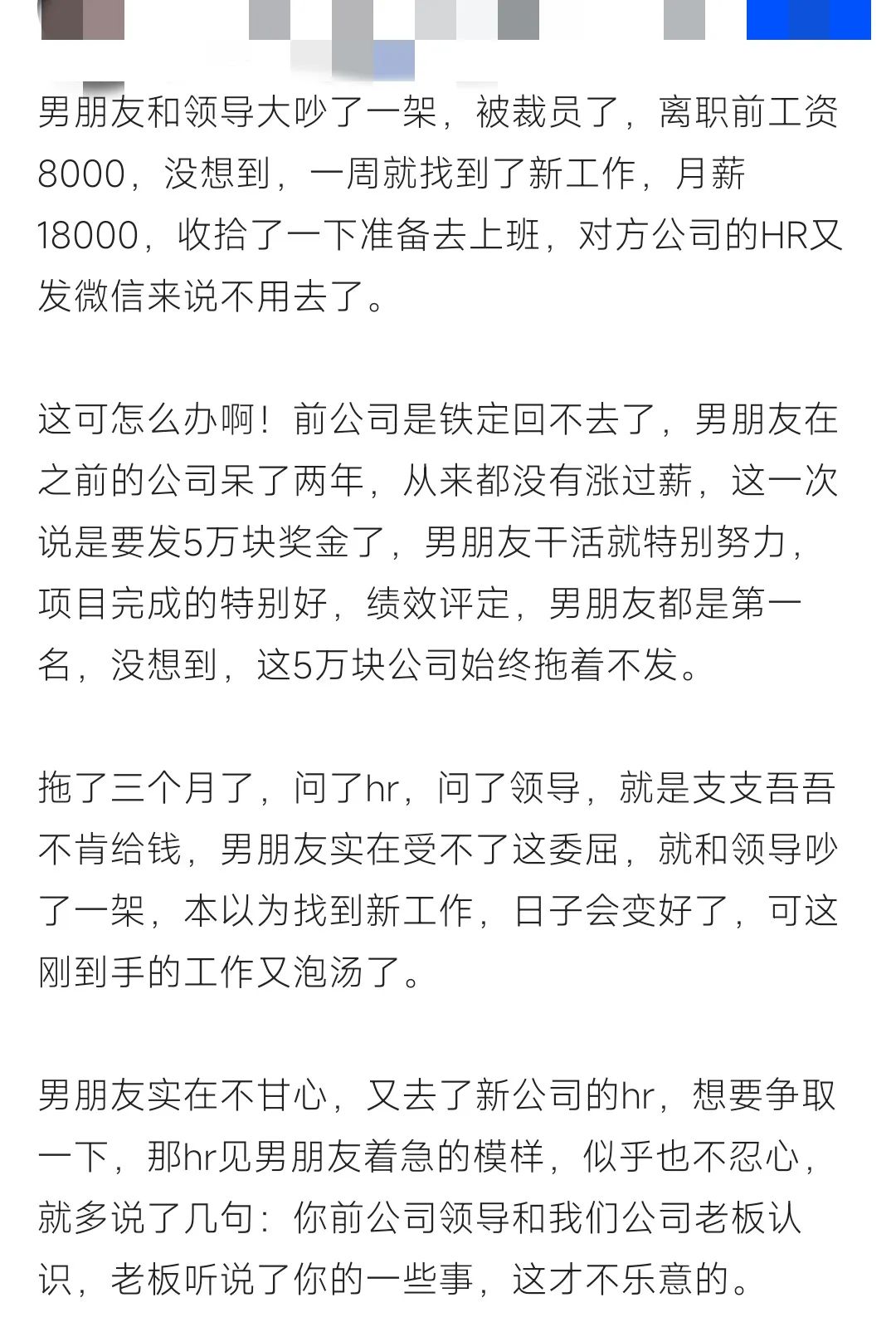 今日帖子,网友发帖称:男朋友和领导吵了一架,被裁员了。离职前工资8000。没想到一周就找到了新工作,月薪18000。收拾一下,准备去上班,对方公司HR又发来微信说不用去了。