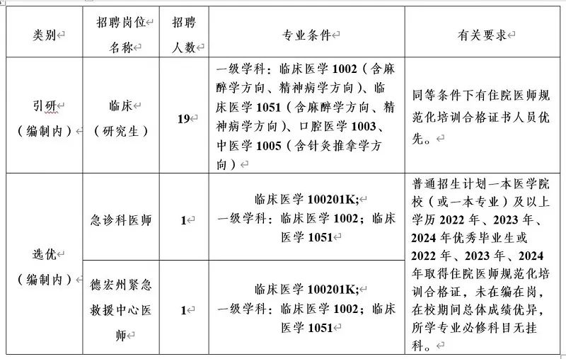 2.急诊科、紧急救援中心医师岗位:普通招生计划一本医学院校(或一本专业)及以上学历2022年、2023年、2024年优秀毕业生或2022年、2023年、2024年取得住院医师规范化培训合格证,未在编在岗,在校期间总体成绩优异,所学专业必修科目无挂科。