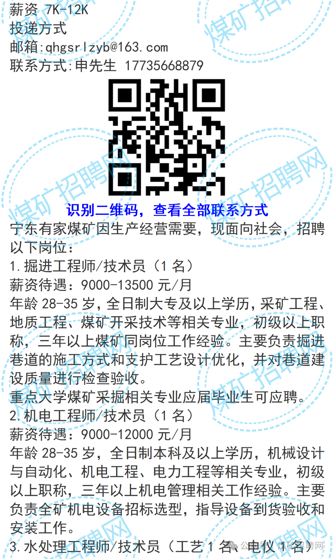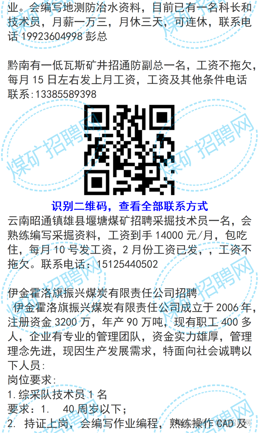 3、三年以上煤矿通防技术员岗位工作经验,有基建矿井通防技术工作经验优先考虑。