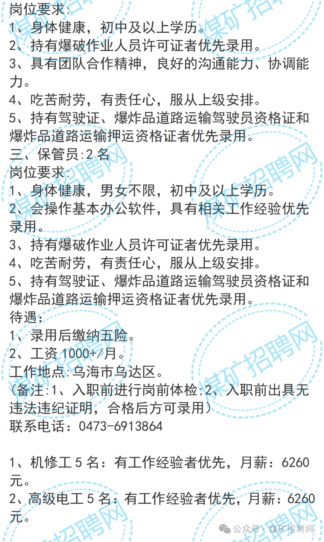 内蒙准旗一煤矿需机电技术员一名,大专文凭,煤矿机电类专业,工资12000/月,交4险,每月有带薪休假。另寻机电科电工一名和井下安全监控巡检工一名,高中以上学历,电工工资12000/月,巡检工7500/月,交4险。联系电话15091500950