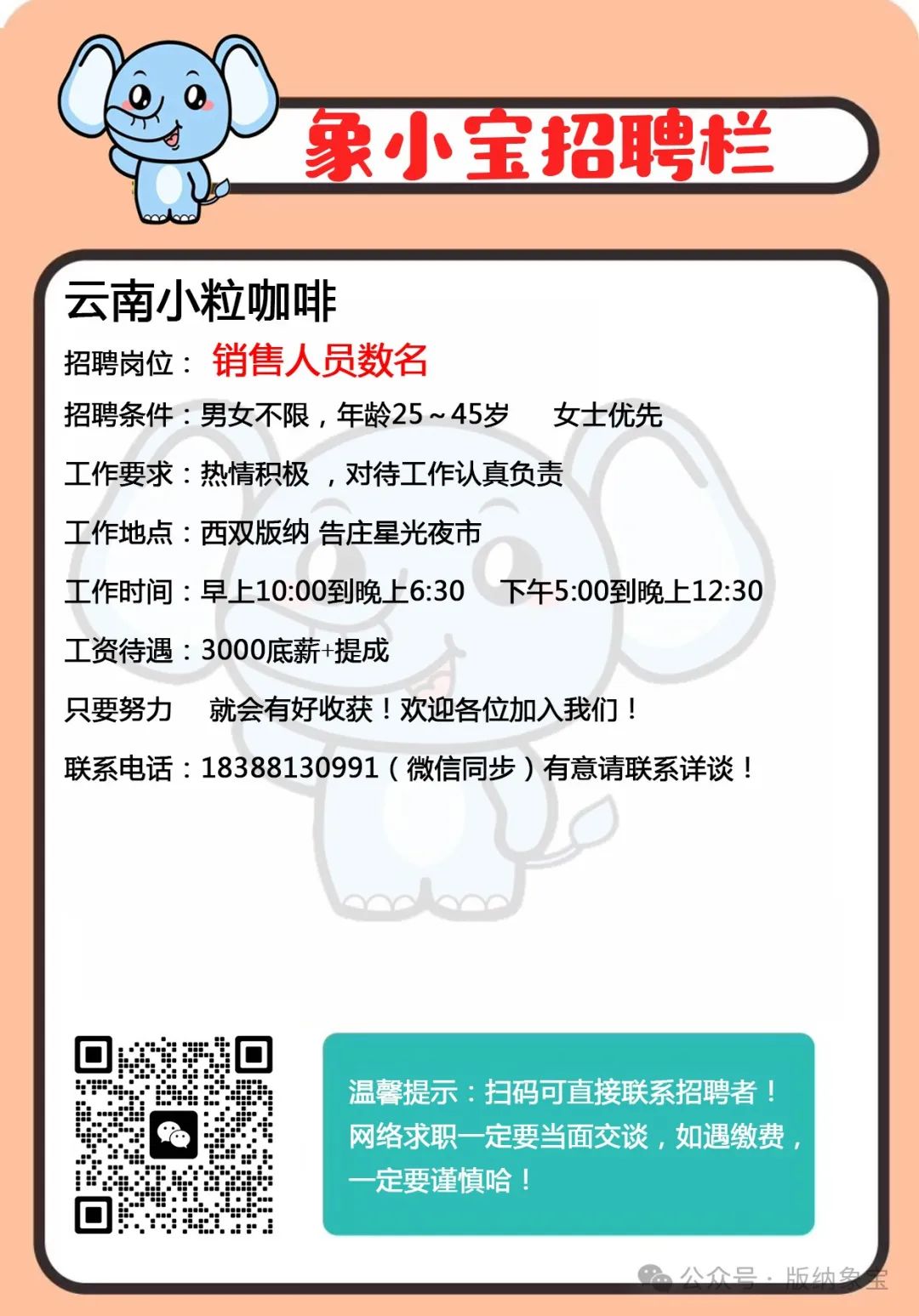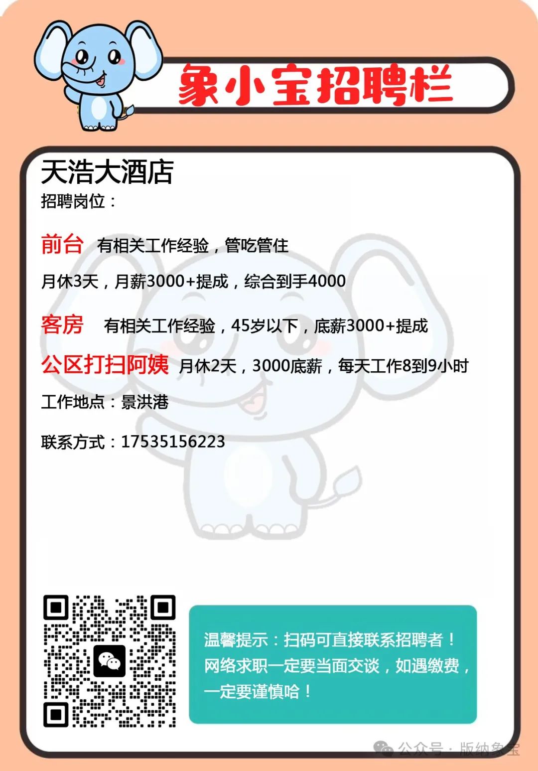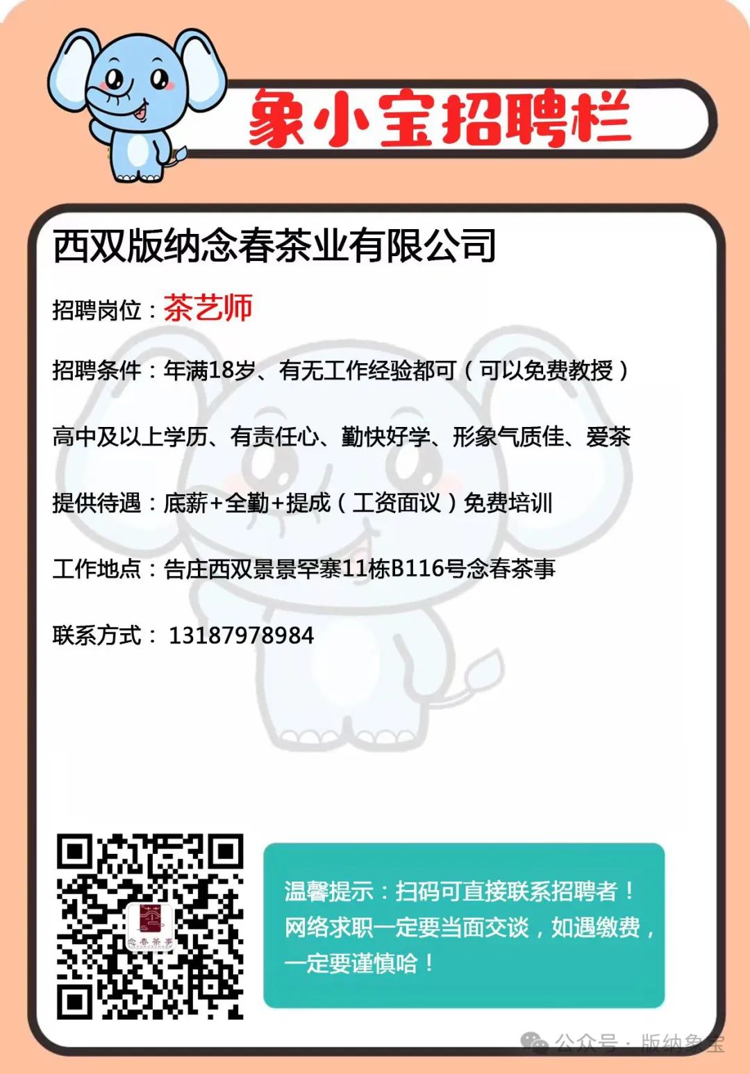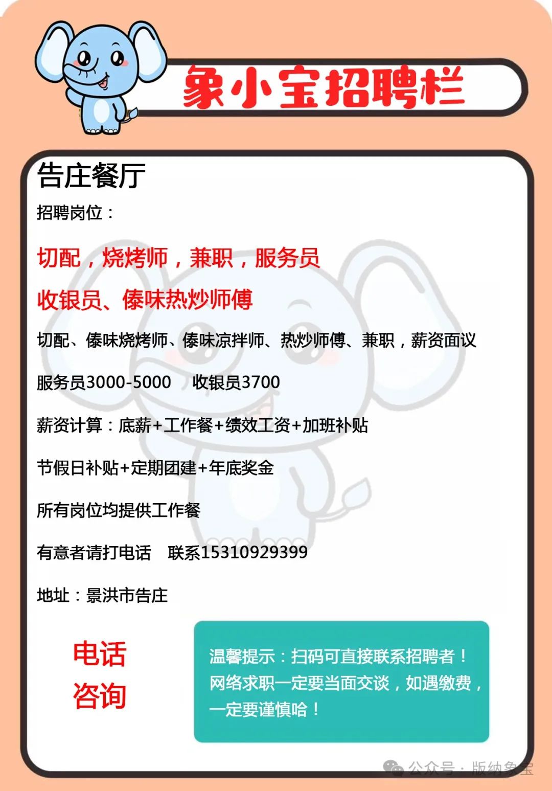 温馨提示:公众号只做网络信息分享,如今网络诈骗多,如有企业收取任何形式费用或需要交钱付款,涉及金钱交易,请大家自行分辨,避免造成损失;如果招工主体、内容与实际不符,请及时向所添加的小宝微信号反映。应聘的小伙伴留好入职相关记录,如遇工资拖欠等纠纷。可前往景洪市劳动保障监察大队地址:景洪市勐混路5号1层