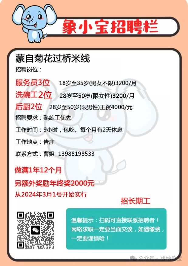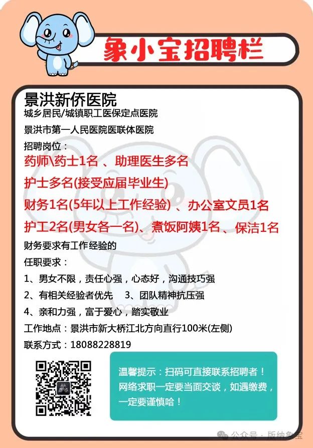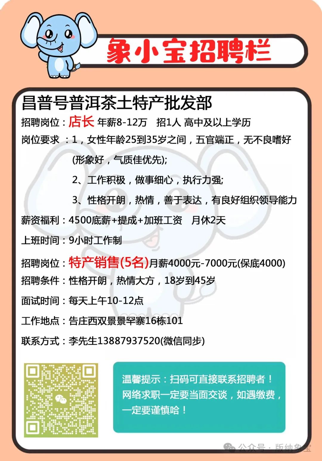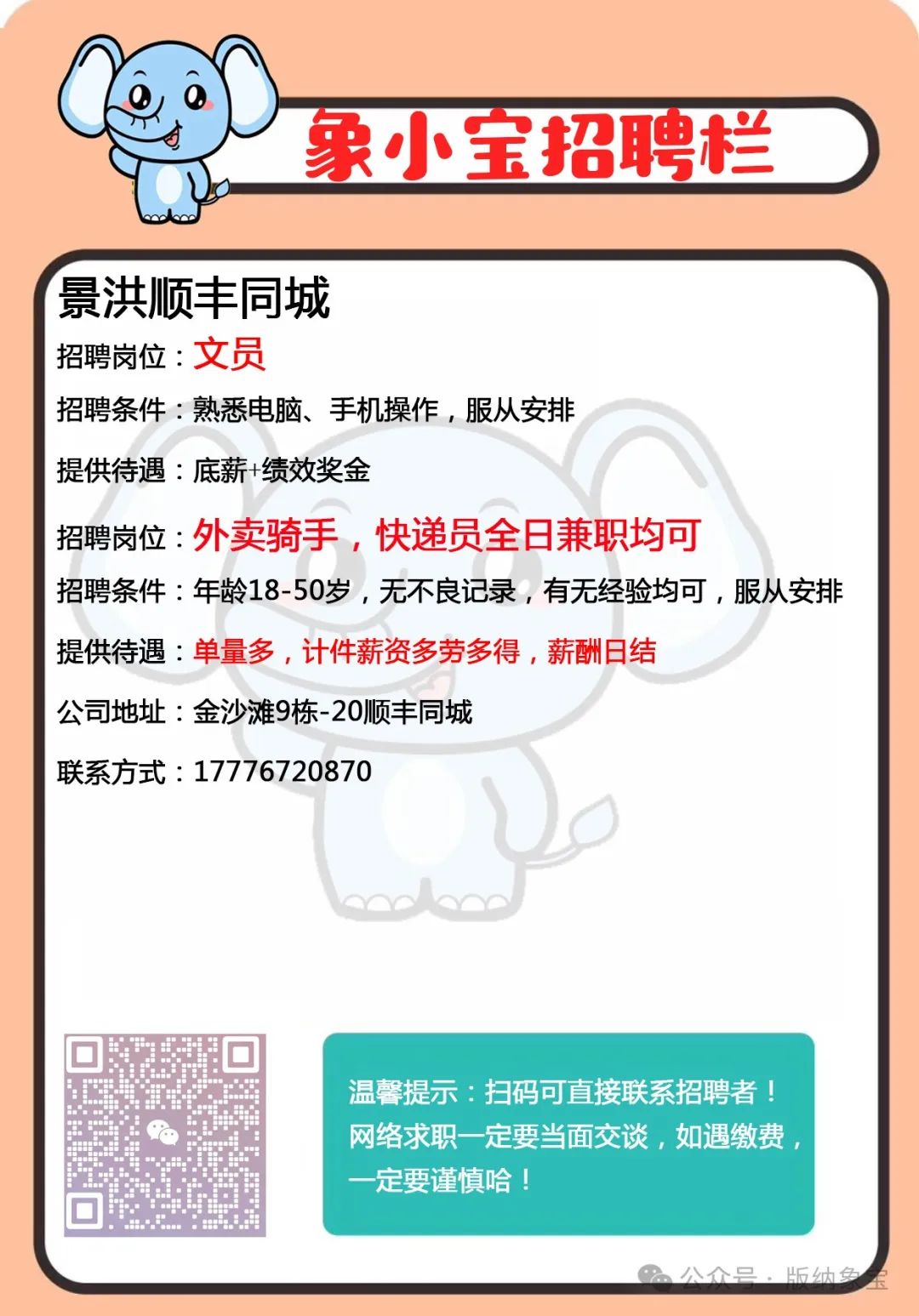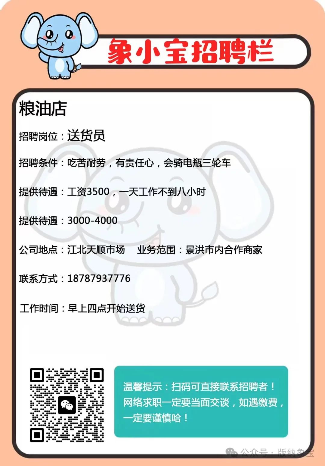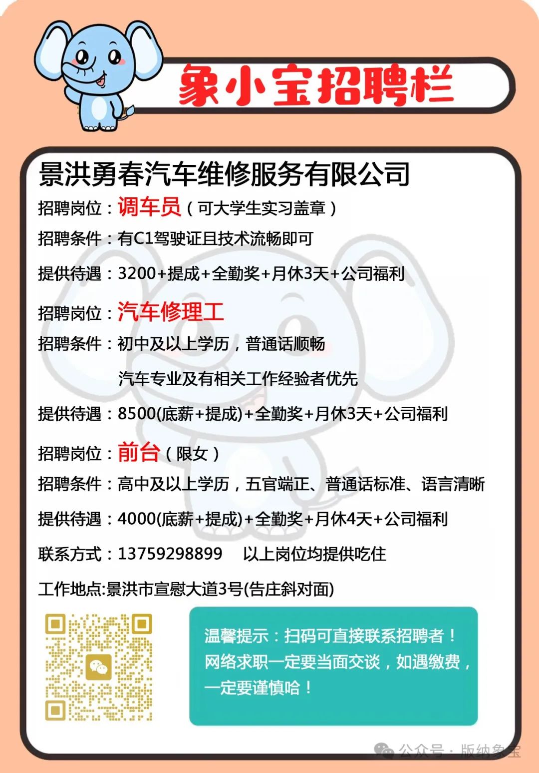 温馨提示:公众号只做网络信息分享,如今网络诈骗多,如有企业收取任何形式费用或需要交钱付款,涉及金钱交易,请大家自行分辨,避免造成损失;如果招工主体、内容与实际不符,请及时向所添加的小宝微信号反映。应聘的小伙伴留好入职相关记录,如遇工资拖欠等纠纷。可前往景洪市劳动保障监察大队地址:景洪市勐混路5号1层