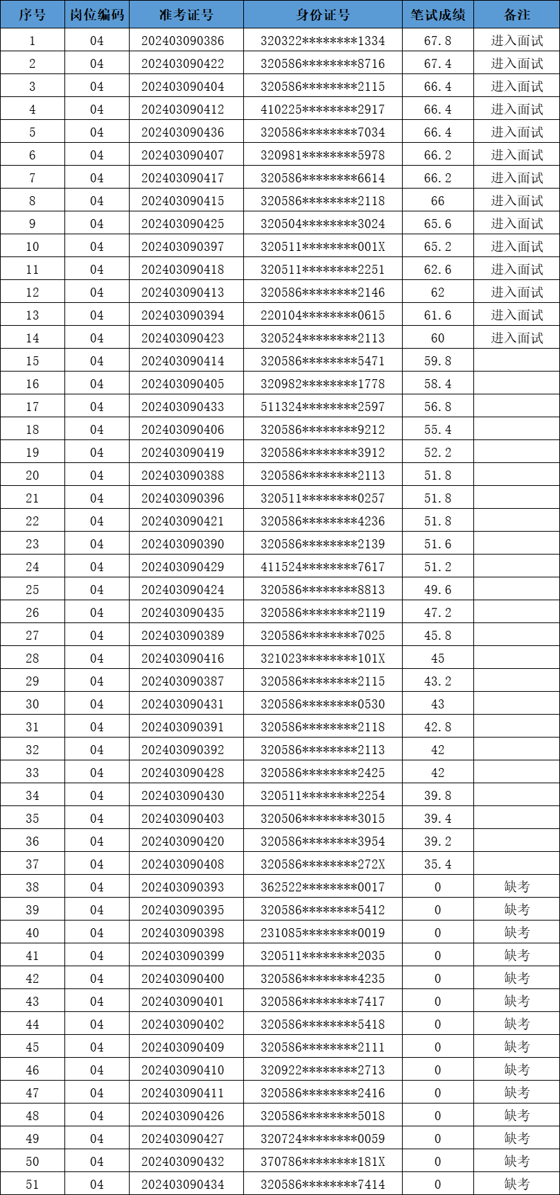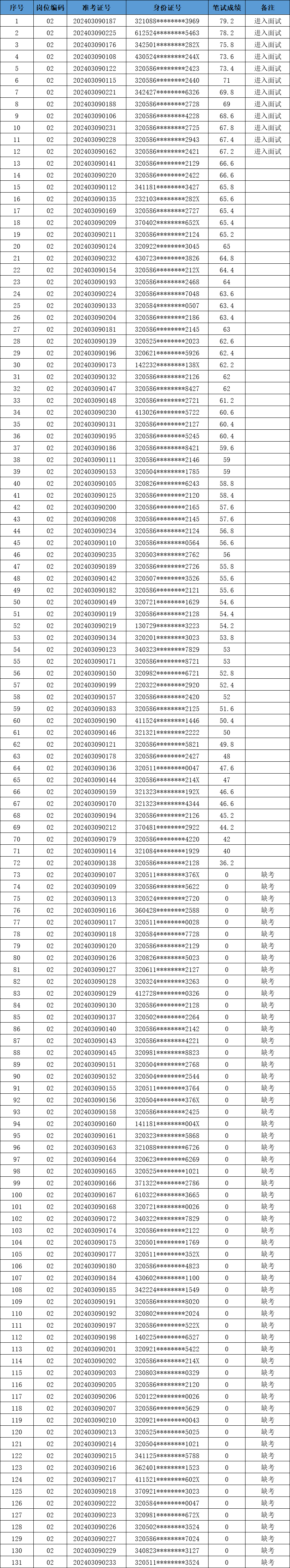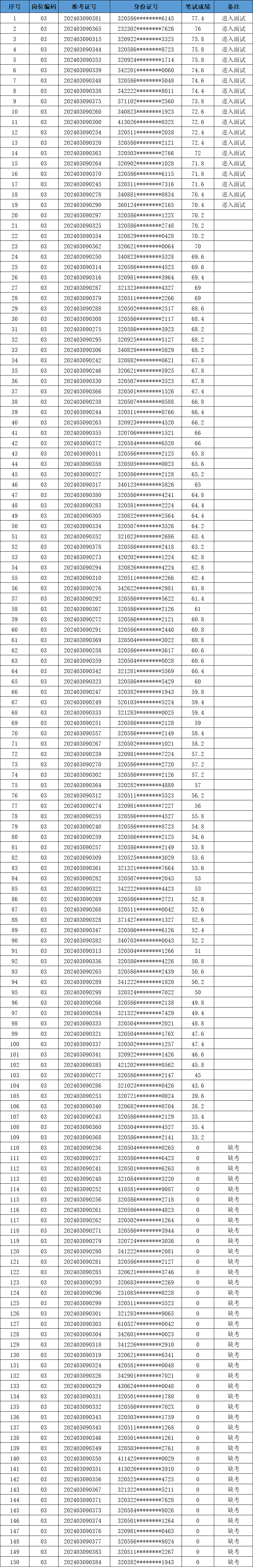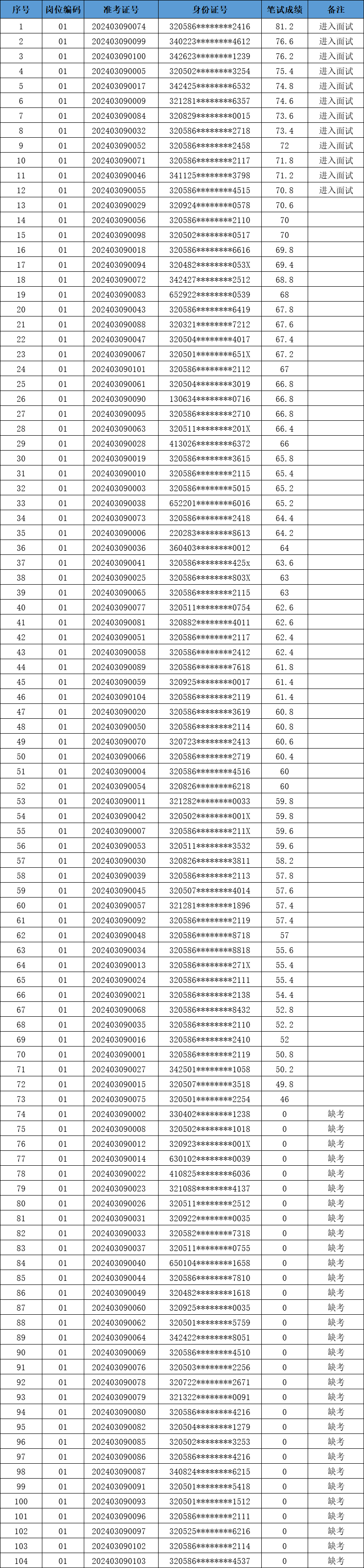 根据《2024年望亭镇公开招聘编外员额管理工作人员公告》安排,已于3月9日完成笔试工作,现将笔试成绩暨进入面试名单公示如下:
