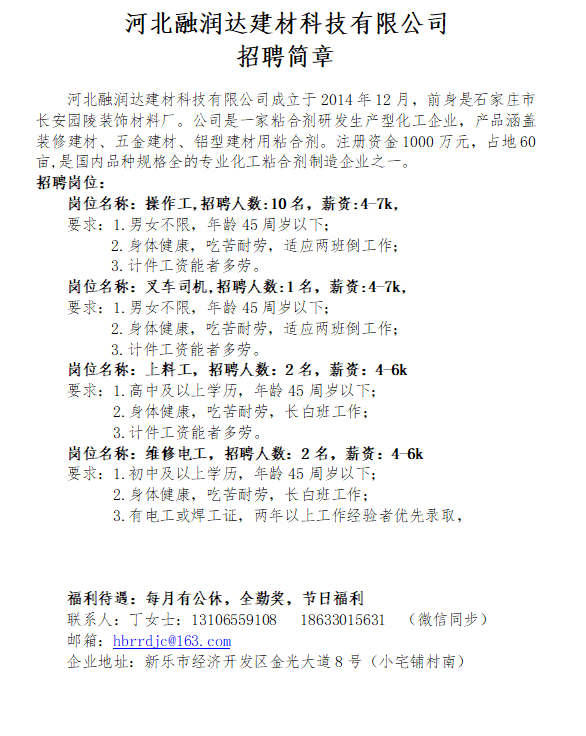 【招聘】普工10名,薪资:4-7k,要求:年龄45周岁以下,身体健康,吃苦耐劳,能适应倒班,计件工资能者多劳。福利待遇:每月有公休,全勤奖,节日福利 联系人:丁女士:13106559108 18633015631 邮箱:hbrrdjc@163.com 企业地址:新乐市经济开发区金光大道8号(小宅铺村南)