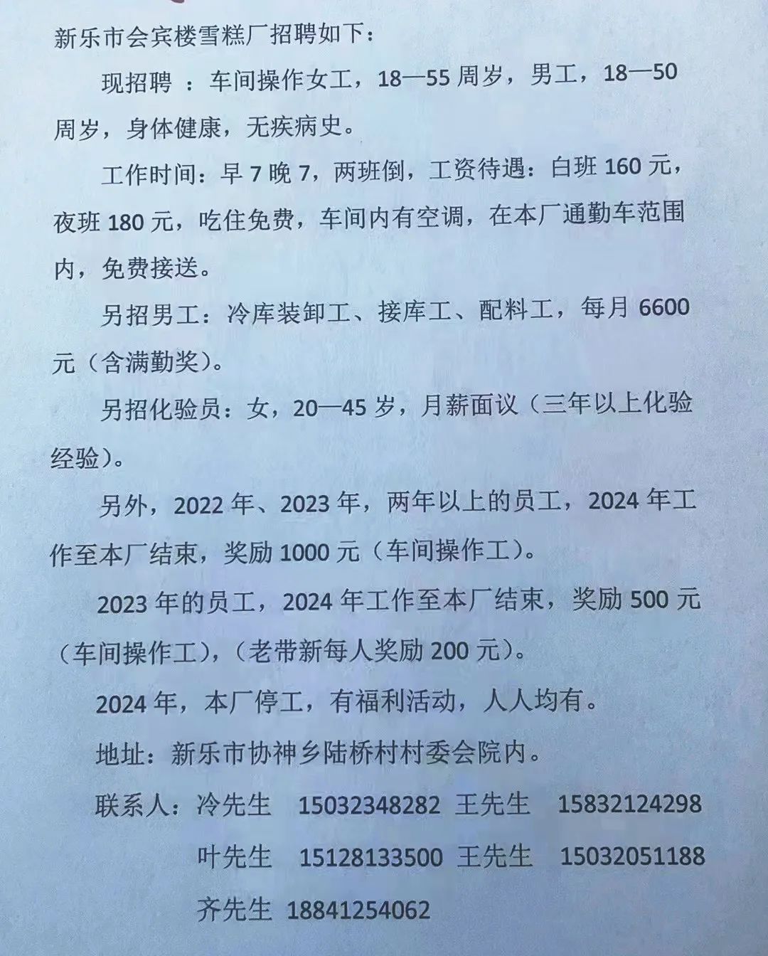 【招聘】车间操作工10名,月工资4000--6000元,免费提供住宿,要求:50岁以下,初中以上学历,吃苦耐劳,能够适应两班倒者优先!地址: 新乐市经济开发区小寨铺村南河北博宇生物科技有限公司 详询电话: 13833393068 19930623755
