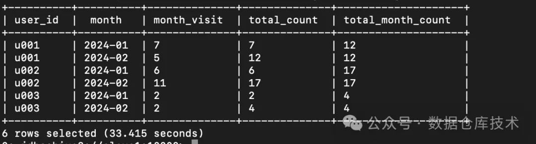 --建表语句create table if not exists t_visit_stat_044(user_id string,visit_date string,visit_cnt bigint)ROW FORMAT DELIMITEDFIELDS TERMINATED BY ','STORED AS orc;--数据插入语句insert into table t_visit_stat_044 values('u001','2024-01-01',3),('u001','2024-01-02',4),('u002','2024-01-03',6),('u003','2024-01-07',2),('u001','2024-02-04',5),('u002','2024-02-10',3),('u002','2024-02-13',1),('u002','2024-02-14',7),('u003','2024-02-11',2);