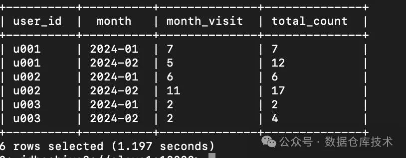 selectuser_id,month,month_visit,sum(month_visit)over(partition by user_id order by month asc) as total_countfrom (selectuser_id,substr(visit_date, 0, 7) as month,sum(visit_cnt) as month_visitfrom t_visit_stat_044group by user_id, substr(visit_date, 0, 7)) t