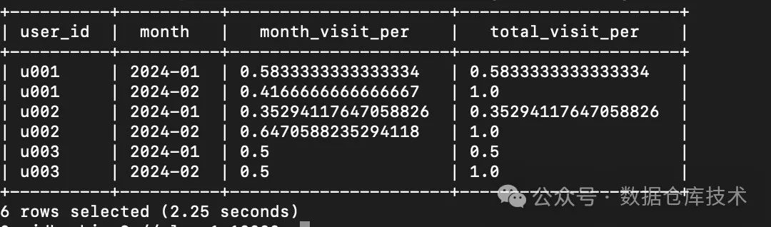 --样例数据+----------+-------------+------------+| user_id | visit_date | visit_cnt |+----------+-------------+------------+| u001 | 2024-01-01 | 3 || u001 | 2024-01-02 | 4 || u002 | 2024-01-03 | 6 || u003 | 2024-01-07 | 2 || u001 | 2024-02-04 | 5 || u002 | 2024-02-10 | 3 || u002 | 2024-02-13 | 1 || u002 | 2024-02-14 | 7 || u003 | 2024-02-11 | 2 |+----------+-------------+------------+--期望结果+----------+----------+----------------------+----------------------+| user_id | month | month_visit_per | total_visit_per |+----------+----------+----------------------+----------------------+| u001 | 2024-01 | 0.5833333333333334 | 0.5833333333333334 || u001 | 2024-02 | 0.4166666666666667 | 1.0 || u002 | 2024-01 | 0.35294117647058826 | 0.35294117647058826 || u002 | 2024-02 | 0.6470588235294118 | 1.0 || u003 | 2024-01 | 0.5 | 0.5 || u003 | 2024-02 | 0.5 | 1.0 |+----------+----------+----------------------+----------------------+