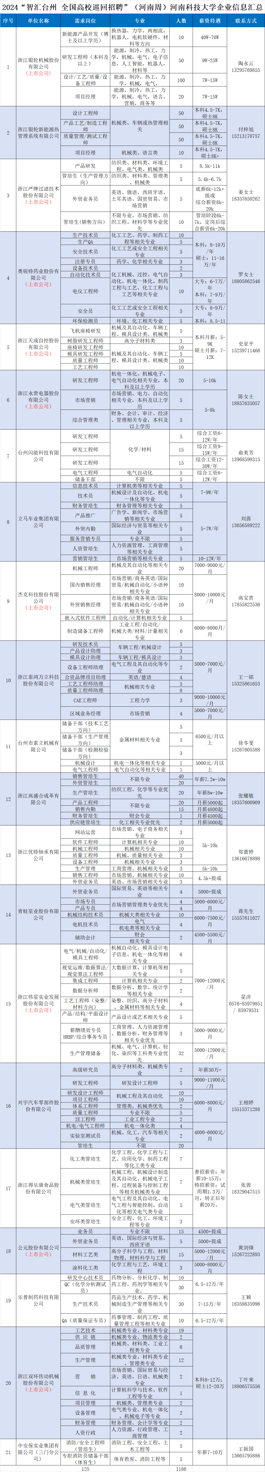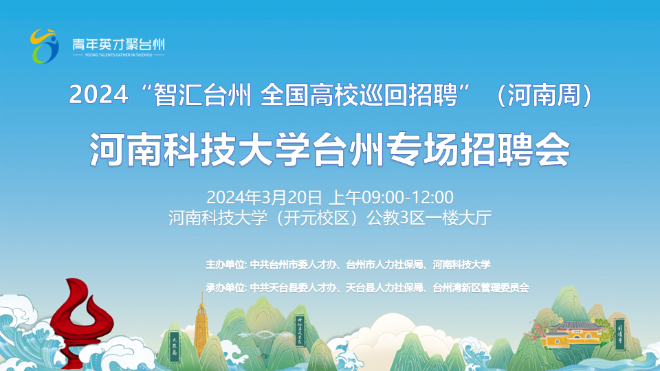 为深入贯彻“人才强市”和“创新驱动发展”战略,助力我市企事业单位引进紧缺急需的各层次人才,为我市建设新时代民营经济高质量发展强市提供有力的人才保障和智力支撑。经研究,天台县人力资源和社会保障局会同台州湾新区管委会,决定于3月20日,开展2024“智汇台州 全国高校巡回招聘”(河南周)河南科技大学台州专场招聘会,现将具体招聘事宜公告如下: