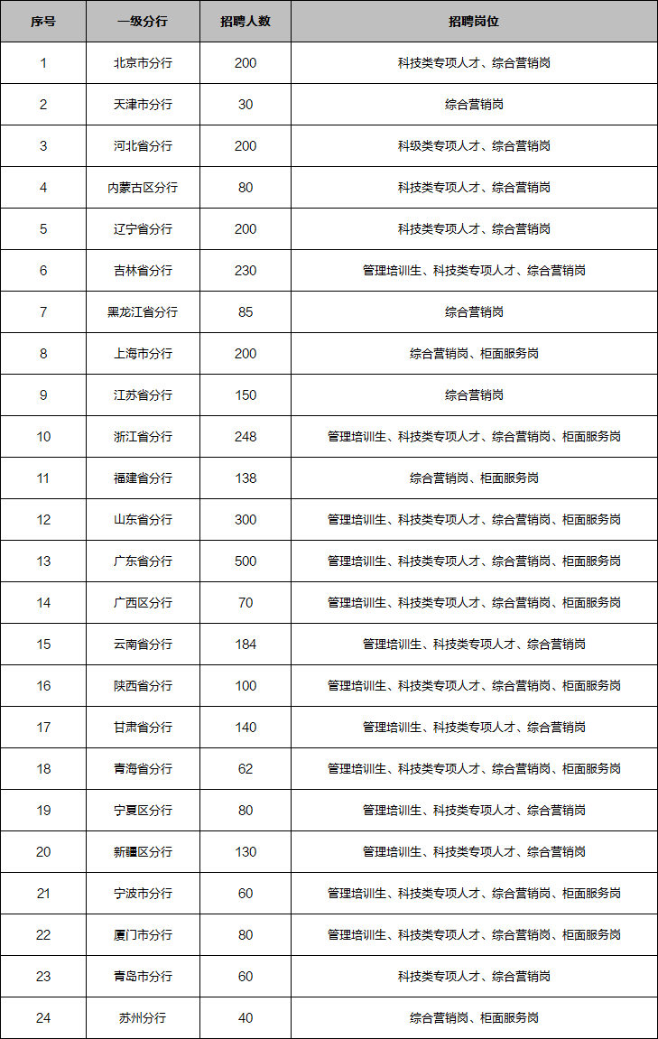中国建设银行境内24家一级分行主要招聘以下岗位: