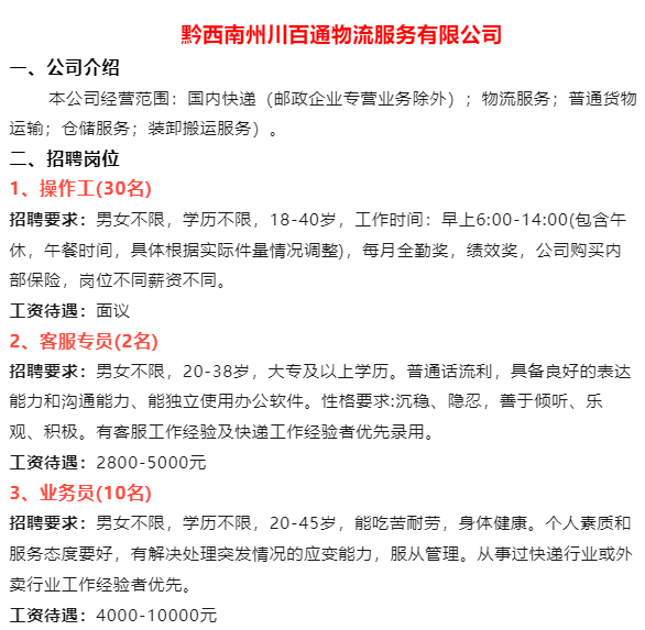>月薪2800元—10000元!招聘操作工!客服专员!业务员!黔西南州川百通物流服务有限公司!