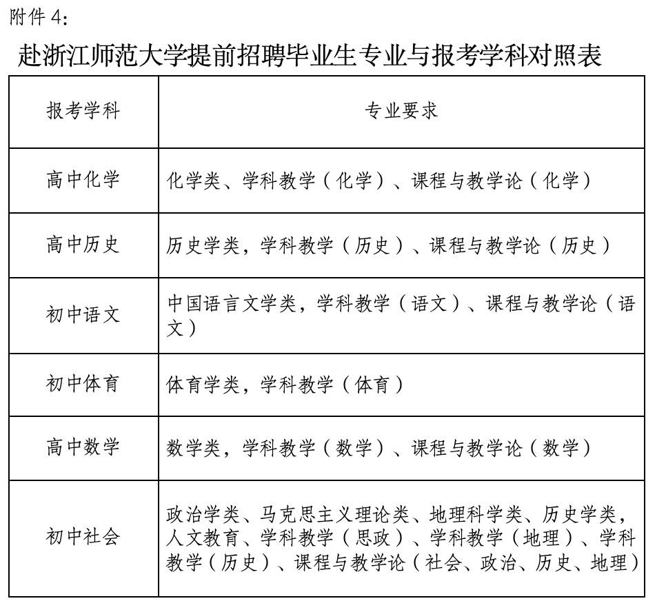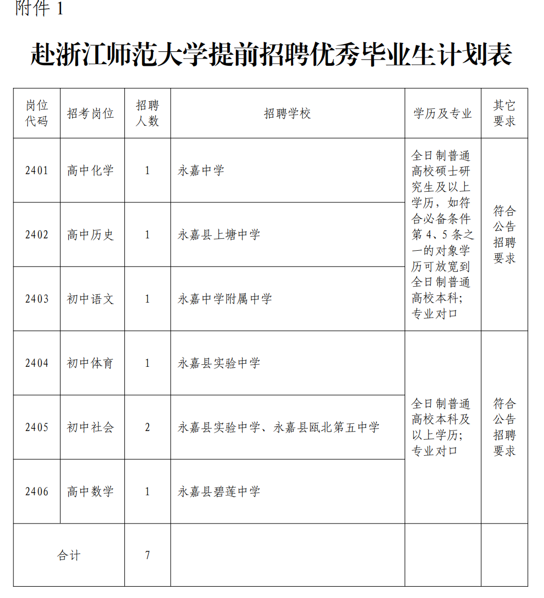 1.拥护中国共产党领导,热爱社会主义,热爱教育事业,热爱学生,品行端正,遵纪守法,有良好的职业道德。2.在2024年7月31日前取得岗位所需的全日制普通高校相应学历及学位,就读专业对口(见附件4)。3.师范类本科毕业生须在2024年7月31日前取得相应教师资格证书,如不能如期取得,不予聘用。非师范类本科毕业生和硕士、博士研究生须在2026年8月底前取得符合报考岗位要求的教师资格证书,如不能如期取得,予以解除聘用合同。4.具有扎实的专业知识、教学基本功,适应岗位要求的身体条件。5.本科生年龄要求在1994年1月1日以后出生,研究生年龄要求在1989年1月1日以后出生。1.浙江师范大学、杭州师范大学、温州大学和宁波大学及浙江省生源被其他高校特控线(即2019年高考一段线)以上录取的2024届全日制普通高校师范类优秀本科毕业生,要求前3个学年综合考评成绩排名处于班级或本专业前50%。2.2024届全日制普通高校师范类本科毕业生,要求前3个学年综合考评成绩排名处于班级或本专业前30%。3.2024届全日制普通高校硕士研究生毕业(具有全日制普通高校本科学历,不包含专升本),其中:国外硕士研究生要求在QS、ARWU、THE、USNEWS世界大学学术最新排名100名以内。硕士研究生、本科所学专业均须与报考学科专业对口。通过招聘工作领导小组组织现场面试可以优先签约。4.九校联盟(北京大学、清华大学、浙江大学、上海交通大学、复旦大学、南京大学、中国科学技术大学、西安交通大学、哈尔滨工业大学)2024届全日制普通高校本科及以上毕业生,通过招聘工作领导小组组织现场面试可以优先签约。5.六所教育部直属师范院校(北师大、华东师大、华中师大、东北师大、陕西师大、西南大学)2024届全日制普通高校师范类本科毕业生,其中公费师范生通过招聘工作领导小组组织现场面试可以优先签约。6.2022年教育部公布的“第二轮‘双一流’建设高校及建设学科的高校”(见附件7)2024届全日制普通高校本科及以上毕业生(不含独立学院毕业生),其中报考体育岗位还须具有国家二级运动员及以上证书。上述各项中的定向培养生、委托培养生、专升本以及网络学院、成人教育学院毕业生不列入本次招聘范围。上述本科学历毕业生应具有相应学士学位,研究生学历毕业生应具有相应硕士学位证书。坚持公开、平等、竞争、择优的原则和德才兼备的用人标准,采取公开报名、统一面试、严格考察、择优聘用的方式。具体程序及方式如下:1.现场报名时间:2024年3月22日(周五)上午10:00-14:00。2.报名地点:浙江师范大学(金华本部)启明篮球场(浙江省金华市迎宾大道688号)。现场报名时,报考者对照公告提供真实可靠材料,未提供相应材料,导致初审不通过,责任自负。报考者与报名工作人员进行沟通、面谈。达成意向的报考者须填写纸质报名表及相关材料。每位考生限报1个岗位。报考者如属于符合第3、4、5条的优先签约对象,经材料审核和现场面试后,由招聘领导小组讨论确定是否签约。报考岗位如已被优先签约而不再空缺的,该岗位报考者可以改报其他符合条件的岗位。(三)资格复审。县教育局组织进行资格复审,审核确定考核人选并通知考核人选参加考核(报名对象须保证手机畅通,因无法联系到考生的,责任自负)。招聘岗位数与报考人数不足1:2的,取消岗位或核减岗位数(符合第3、4、5条的优先签约对象不设开考比例)。(四)考核。考核形式为模拟课堂教学,主要考查考生教学基本功。模拟课堂教学是从教材中抽取一个课题,根据该课题的内容确定教学目标,设计教学方案,实施模拟课堂教学(课堂没有学生),考生通过完成相应的教学任务,来表现自己的教学思想、教学能力和教学基本功。备课时间60分钟(不携带任何参考资料,上课课题由举办方提供),模拟课堂教学15分钟。考核(模拟课堂教学)满分100分,合格分数线为75分,低于75分合格线者,取消本次聘用资格。考核成绩如遇同分,进行加试,加试采取基本素养面试答辩,时间5分钟。考核人选按指定时间地点凭身份证报到、集中,抽取考核序号,备课后依次进行考核,统一集中封闭式考核。依据考核成绩从高到低依次按1:1确定拟聘用对象,不再递补。签订就业协议。入围对象须按规定时间、地点和要求(具体时间、地点另行通知),携带本人身份证参加体检。不按规定时间、地点和要求参加体检的,视作放弃体检。因体检、考察不合格或个人放弃等原因出现空缺,不再递补。根据体检、考察结果,确定为拟聘用对象,在永嘉县政府信息公开网公示7个工作日。公示期满无异议的,按规定程序办理聘用手续。拟聘用人员名单公示期满后,本人放弃聘用资格或无正当理由逾期不办理聘用手续的,取消聘用资格。拟聘人员须在2024年7月31日前提交岗位要求的学历证书、相应学科的教师资格证书、毕业生就业报到证,并将个人档案寄送永嘉县教育局人事教育科(地址:永嘉县东城街道码道街67号,邮编:325100)。不按规定时间提交相关证书的,取消聘用资格,解除就业协议。要求于2026年8月底前提供相应教师资格证书的聘用人员,未能在该时间点前提供相应教师资格证书的,予以解除聘用合同处理。对于证件不全、档案未转入、提供虚假证件材料或经审核发现不符合招聘条件的,取消聘用资格。在办理聘用手续前,自动放弃或接到举报经查实不符合条件的,取消