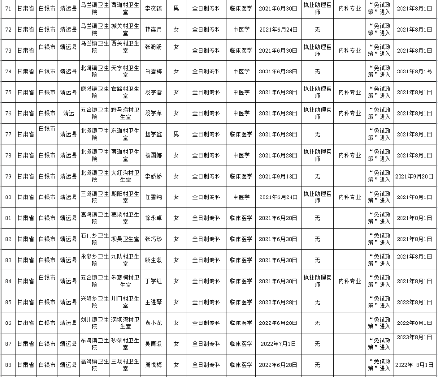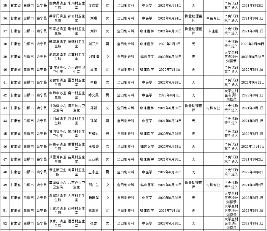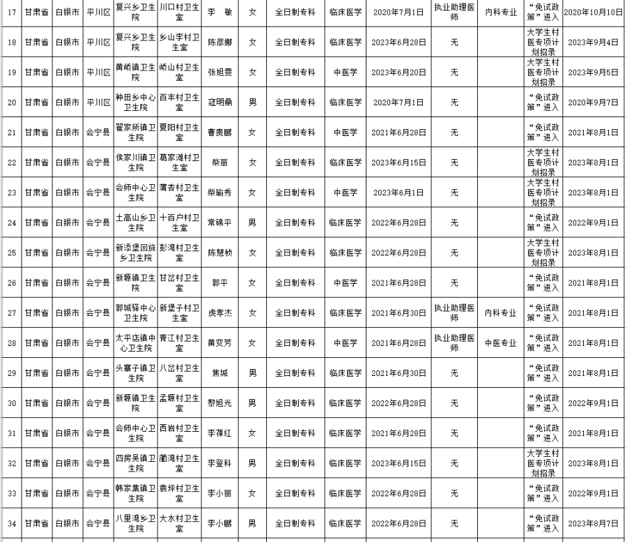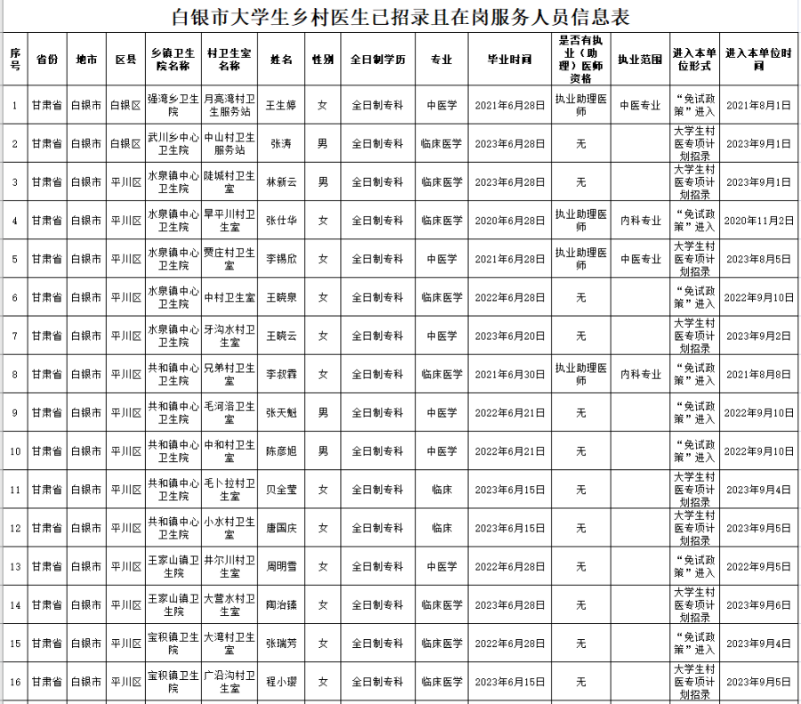 附件:白银市大学生乡村医生已招录且在岗服务人员信息表