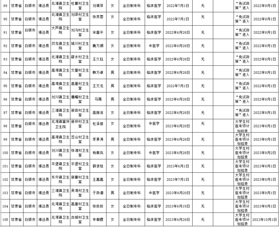 通过各级资格审核,目前仍在白银市乡镇卫生院(不含社区卫生服务中心)一体化管理的村卫生室(不含社区卫生服务站)服务的105名大学生乡村医生(人员名单详见附件)。