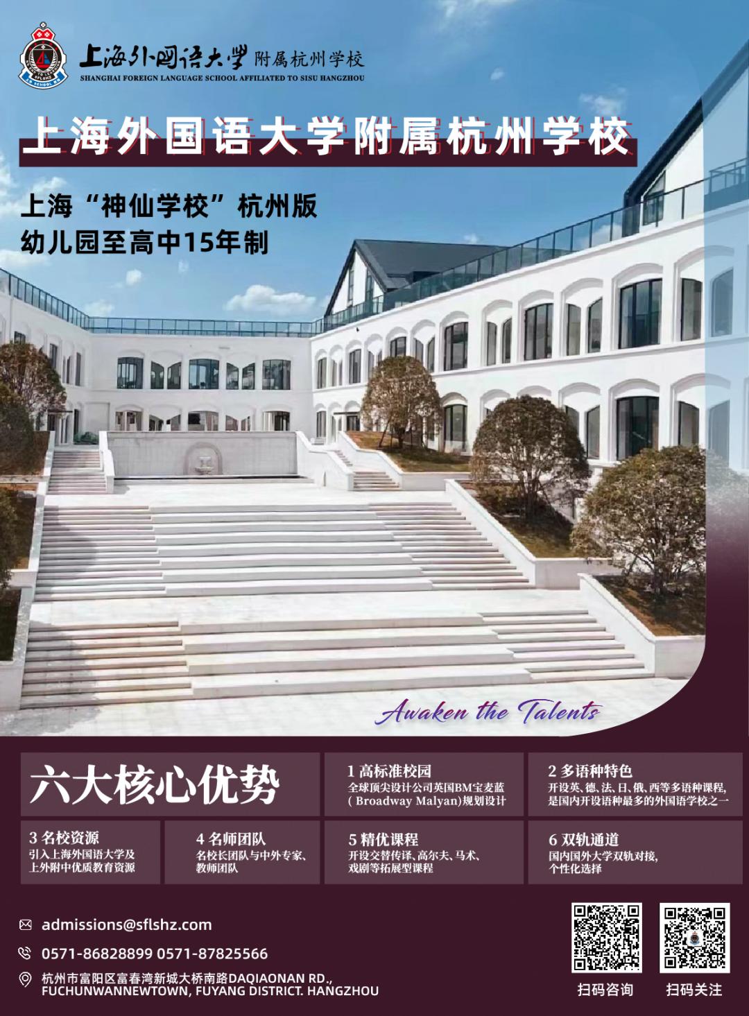 上海外国语大学附属杭州学校秉承上海外国语大学和上外附中的办学宗旨,充分发挥两校教育资源优势,以培养外语见长、文理并举、复合型、高层次、高素质的国际型预备英才为办学目标。学校含幼儿园、小学、初中、高中全学段,可容纳3000名学生。