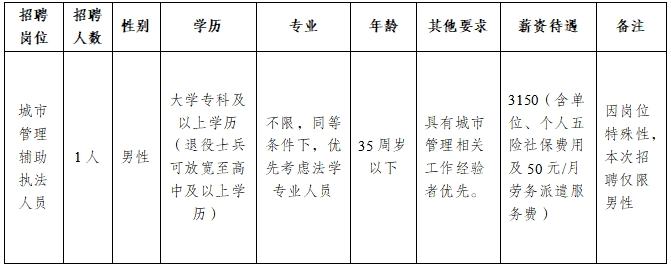 本次计划公开招聘城市管理辅助执法人员1人,报考人员在符合招聘基本条件基础上,需符合岗位招聘条件,具体岗位及资格范围条件详见下表: