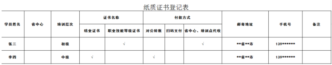 2)证书申请 证书形式上分为电子证书、纸质证书两种,默认为电子证书(无需申请)。 考核通过的学员:需纸质证书的请联系北极星各地合作机构,填写相关信息进行申请,表格示例如下: