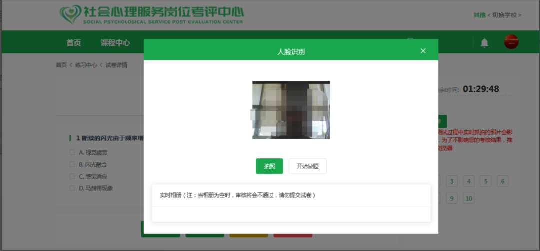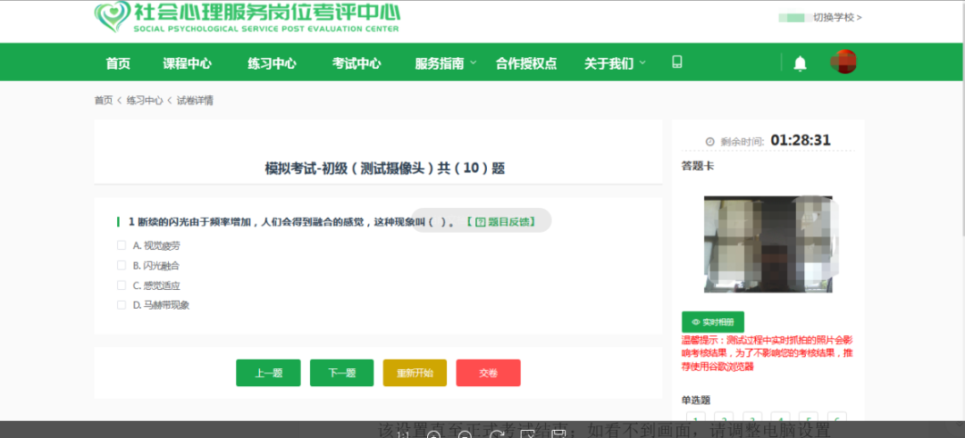 3、考试 考生登录学习平台,进入考试中心-立即考试,按照考试时间安排进行考试; 备注:考试分为专业知识和专业技能两门,每门用时1.5小时,每门考试结束请务必提交答卷。  1)摄像头测试:进入练习中心-模拟考试进行摄像头测试,如果摄像头工作正常,可点击拍照后,进入答题界面,答题过程中,右侧可看到实时画面,直至交卷;