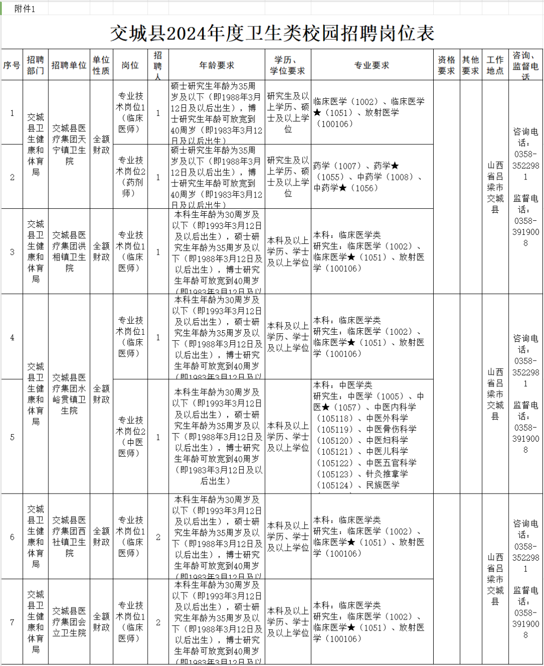 咨询、监督电话详见《交城县2024年度卫生类校园招聘岗位表》(附件1)。