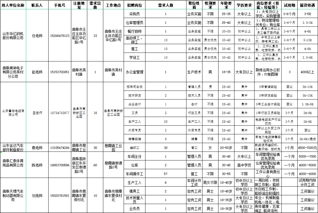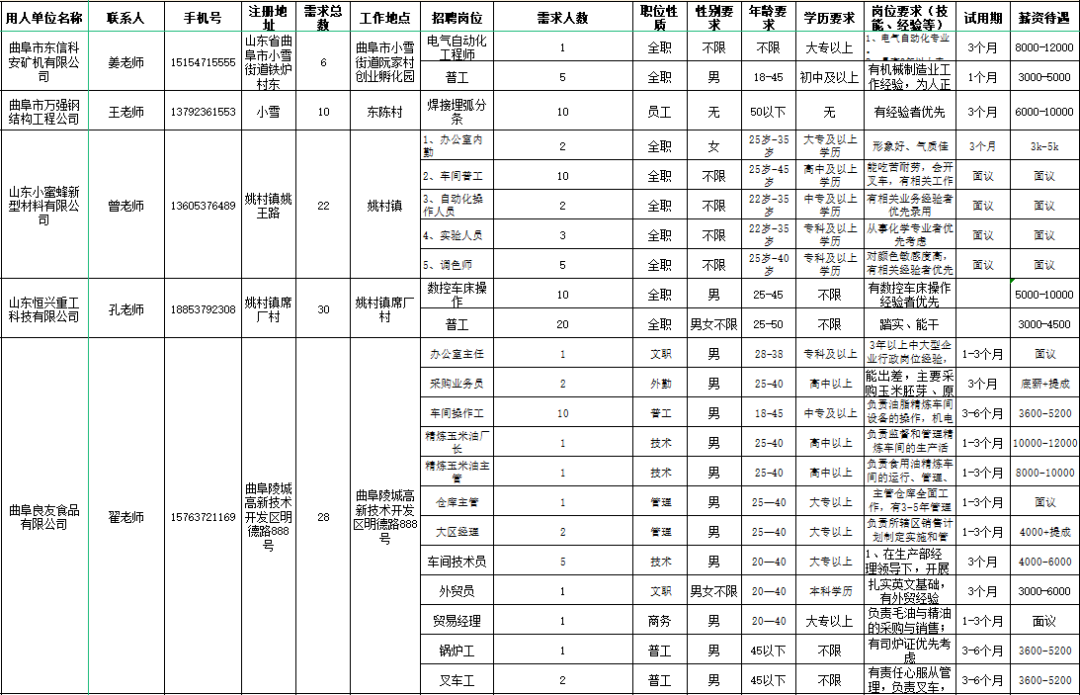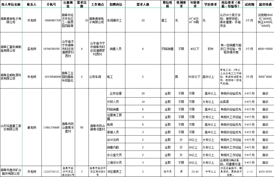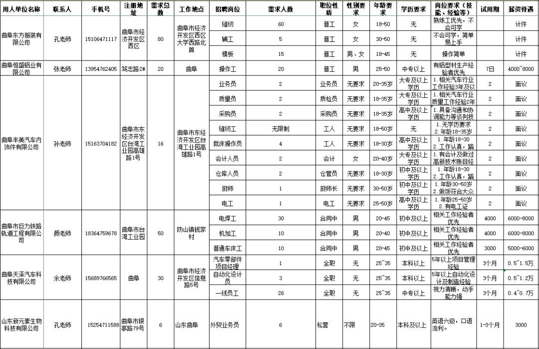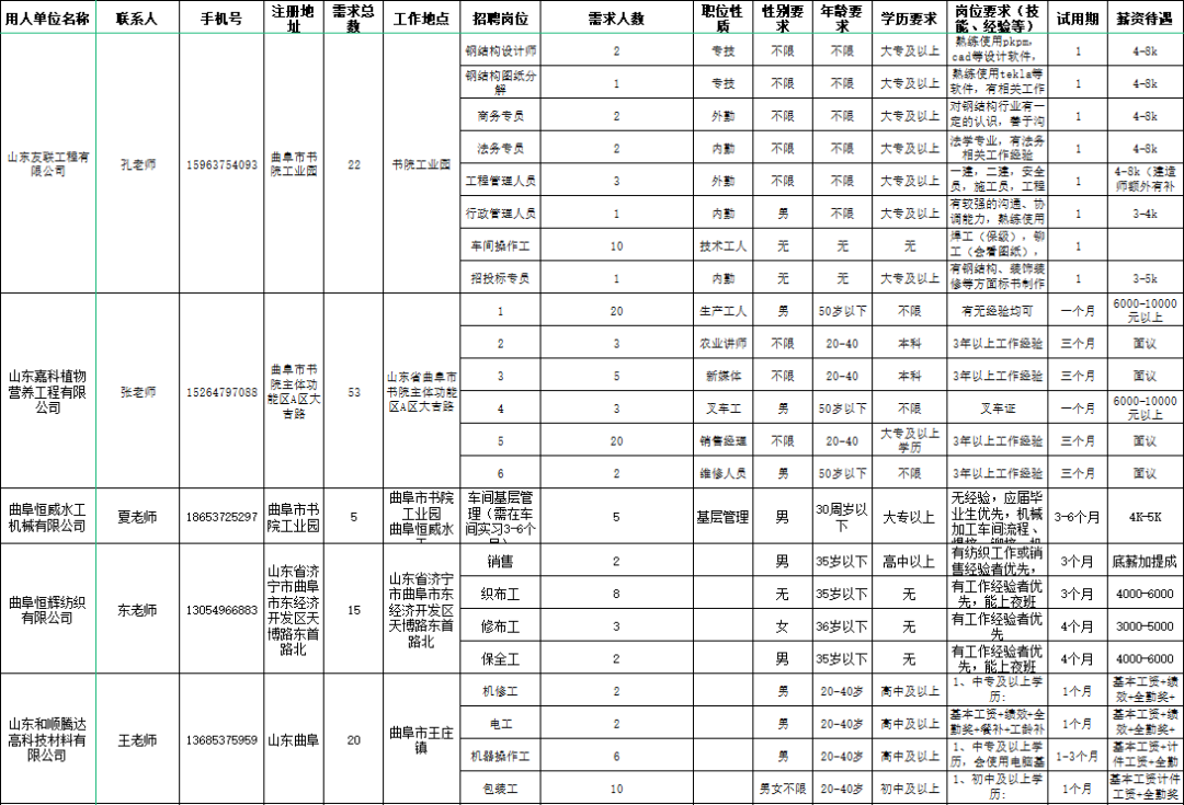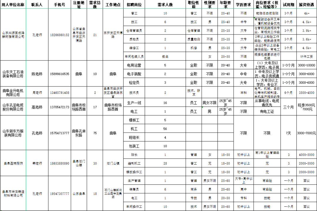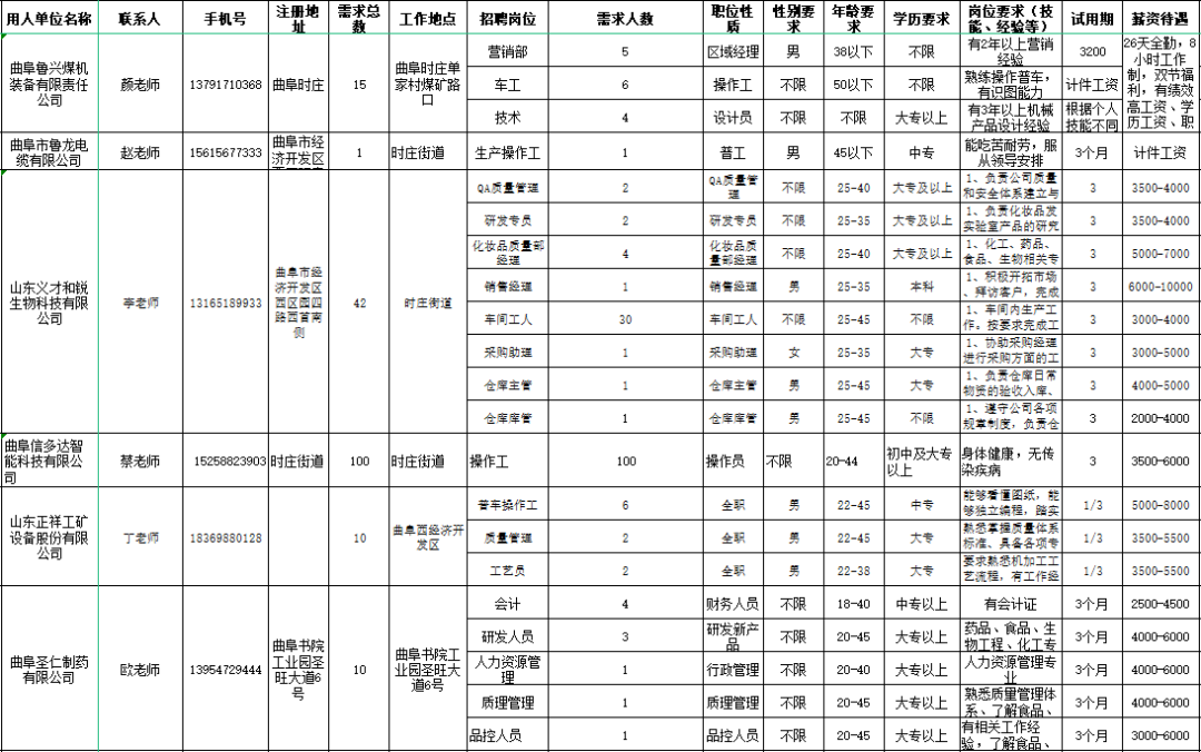 各位同学们 你是否还在为找工作而迷茫 赶紧看过来啦! 这些单位正在招人哦!岗位多多! 详细岗位内容跟着团团来看看啦~ ![]() 为做好春节后劳动者换岗流动高峰期和企业复工复产关键期就业工作,助力规上企业发展, 团市委联合省派驻曲阜市“四进”工作支队发布相关招聘岗位,涉及40家企业1022个岗位,求职者可通过联系电话与企业沟通。 广大求职者若有应聘意向, 请致电企业联系人。 ![]()