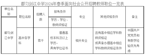 点 ☀贵阳教师招聘,汇集贵阳教师招聘信息,包含贵阳幼儿、中小学、高校、教育培训机构等,想要快速招到大量合适人才,获取新鲜招聘信息,找到好工作,请关注!【每天中午12:00发布】 温馨提示:感谢您关注贵阳教师招聘!因网络诈骗现象较多,花样百出,请提高警惕,谨防上当受骗!前往应聘面试或去某一地工作时,最好跟亲朋友好友告知一声去向,祝大家顺利找到好工作! 发布招聘信息【点击➯联系小编发布招聘信息】 ![]() 都匀剑江中学是2000年经黔南州教育局批准成立的最早的民办完全中学。学校认真贯彻党的教育方针,秉持“立德树人、教育兴校、质量强校、依法办校”的办学理念,以师生全面发展、教学质量全面提高、学校文化整体提升为发展总目标,力争把学校办成贵州省科学、诚信、规范、一流的民办高级中学。为了加强我校教师队伍建设,补充新的力量,围绕班主任+核心骨干教师团队模式进行有目的的培养。特制定《2023年都匀剑江中学招聘简章》 ![]() (一)坚持按需设岗、按岗招聘的原则; (二)坚持德才兼备、任人唯贤的原则; (三)坚持公开、平等、竞争、择优的原则; ![]() (一)招聘岗位
