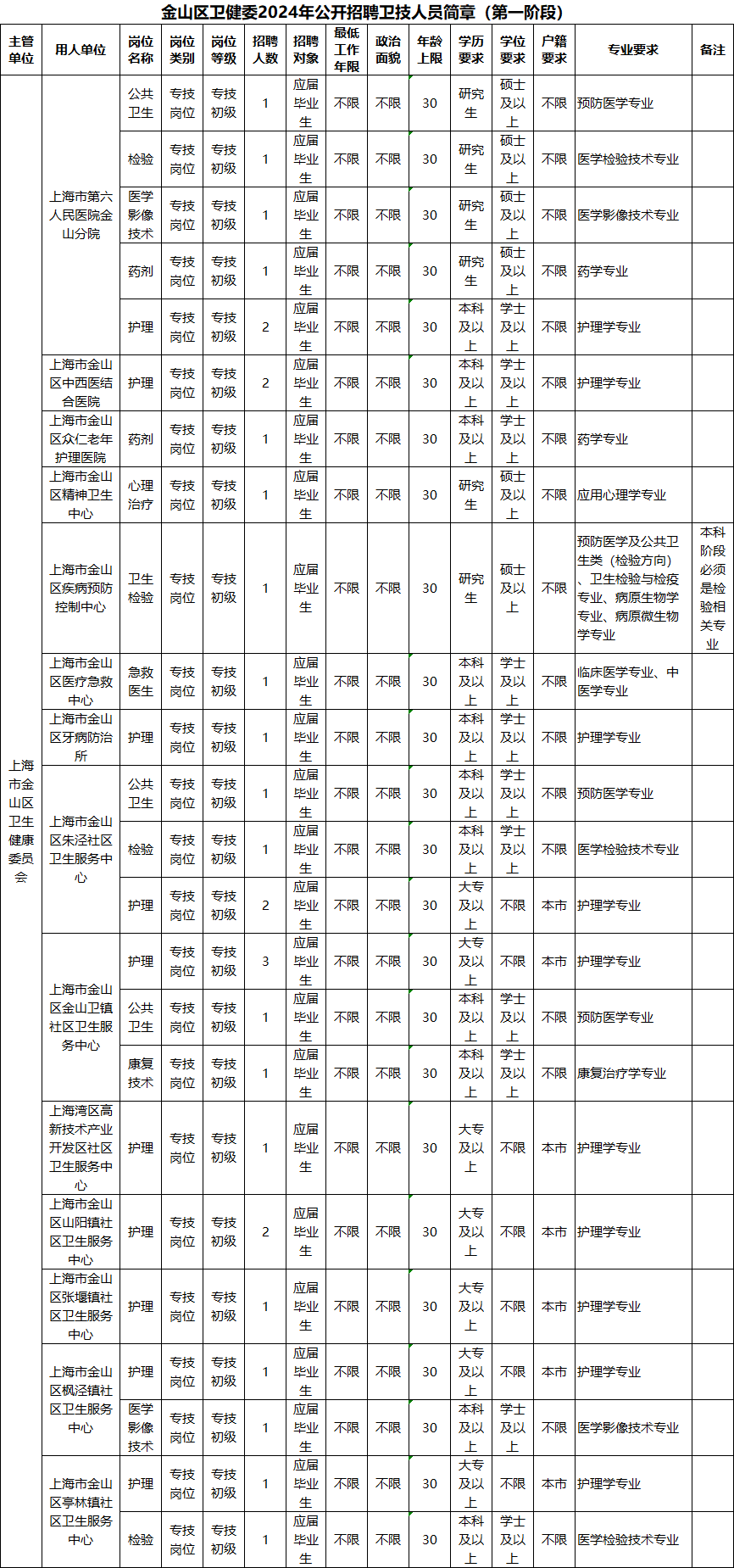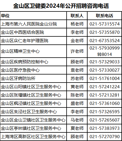1.招聘对象:紧缺急需专业应届毕业生或其他卫生专业硕士研究生及以上应届毕业生。(1)招聘对象:除全年招聘外其他卫生专业应届毕业生。(1)招聘对象:非应届毕业生及第一阶段未完成招聘计划的其他应届毕业生。(1)全年招聘。由各用人单位通过校园或网络招聘等形式,发布公开招聘信息,应聘人员根据招聘信息要求进行报名。①第一阶段招聘。应聘人员于2024年3月8日起登录“上海市金山区人民政府”网站(https://www.jinshan.gov.cn/index.html)和“金山鑫健康”微信公众号了解招聘简章(附件1)。有意者于2024年3月20日之前,将报名表(附件3)及相关材料电子稿发送至邮箱:jswszp@163.com;邮件主题请设置为:意向单位+应聘岗位+姓名。材料要求:报名表、身份证、毕业生就业推荐表、成绩单、英语和计算机等级证书以及个人荣誉等相关材料。②第二阶段招聘。具体招聘信息将于2024年7月另行发布在“上海市金山区人民政府”门户网站和“金山鑫健康”微信公众号。应聘人员在规定时间内根据相关要求进行报名。(1)报考人员根据自身情况、拟报考岗位的资格条件和专业要求等,每人限报考一个岗位,提交后不能更改。(2)本次招聘实行告知承诺制。报考人员应确认本人完全符合所报岗位的报考条件,如对报考条件和岗位要求存在疑问,应及时咨询确认。报考人员应依据公布的报考条件和《招聘简章》中的具体岗位要求,如实填写个人信息,如不符合报考条件,由此产生的后果,责任自负。(3)报考人员应对个人信息的真实性负责。如实填报,凡提供虚假的不实信息者,将被取消应聘资格,并列入失信名单。1.资格审查:网上报名结束后,对报考人员组织资格审核。2.综合考核:通过资格审核的人员由区卫健委会同用人单位组织综合考核,综合考核采取笔试、面试、技能测评相结合,主要考核应聘岗位相关的专业理论水平、业务能力、综合素质。根据综合考核情况,按1:1比例确定拟录用人选。1.体检:参照《国家公务员通用体检标准(试行)》,统一组织到本区二级及以上综合性医疗机构进行体检。2.考察:主要考察报考人员的政治思想、遵纪守法、能力素质、学习和工作表现以及诚信记录等。对体检和考察合格的拟录用人员名单在上海市金山区人民政府”门户网站“金山健康”专栏进行公示,公示时间7天。公示无异议的,按规定办理事业单位聘用手续。政策咨询:021-57932880    联系人:谢老师、郑老师