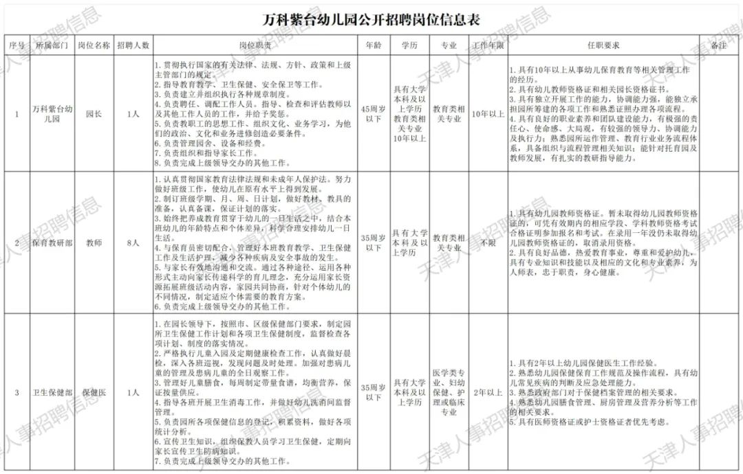 2024天津滨海新区万科紫台幼儿园公开招聘10人公告 按照区委、区政府对滨海新区学前教育深化改革的总体要求,为激活办学机制、增强办学活力与效益,有效盘活闲置教育资源,更好地服务滨海新区教育事业,天津滨海教育发展集团有限公司(以下简称“教育发展集团”)筹建天津市滨海新区塘沽第一幼儿园万科紫台分园(暂定名称,最终以工商核定为准,以下简称“万科紫台幼儿园”)。为办好教育发展集团首个幼儿园,开展学前托幼各项业务,充实人才队伍,根据教育发展集团经营情况及发展需求,拟面向社会公开招聘部分工作人员。 一、选聘岗位点击查看更多招聘信息 拟招聘3个岗位,共计10人。 1.园长岗位1人 2.教师岗位8人 3.保健医岗位1人 招聘岗位所需专业、学历、工作年限和其他条件见附表。 二、面向范围 面向全社会公开招聘 三、资格条件及岗位要求 (一)资格条件 应聘人员具有较好的政治素质,认真学习贯彻习近平新时代中国特色社会主义思想,牢固树立“四个意识”,坚决做到“两个维护”,坚持国有企业的社会主义方向,熟悉幼儿园教育管理工作,具备与职位相匹配的任职经历和专业素养,职业信用和个人品行良好。同时,具备以下任职资格条件: 1.遵纪守法,品行端正,诚信廉洁,勤奋敬业,作风严谨,具有良好的团队精神和职业素养。 2.所招聘人员应符合岗位对应的能力要求,身心健康,具有正常履行职责的身体条件,具备良好的抗压能力。 3.执行力强,能高效完成本岗位职责及上级领导交办的其他工作。 4.具备大学本科及以上学历。 5.满足岗位设定的其他条件。 6.年龄及工作年限时间计算截至2024年3月12日。45周岁以下是指1979年3月12日之后出生;35周岁以下是指1989年3月12日之后出生。 (二)岗位要求 具体岗位任职资格及要求请查阅《万科紫台幼儿园公开招聘岗位信息表》。 (三)凡有下列情况之一者,不符合报名条件: 1.正在接受审计,或涉嫌违纪违法正在接受有关部门审查尚未做出结论的; 2.受到诫勉、组织处理或者党纪政务处分尚处于影响期内的; 3.因违纪违法被党政机关、事业单位、企业开除公职或开除党籍的; 4.个人在企业经营管理活动中有弄虚作假记录的; 5.配偶已移居国(境)外,或者没有配偶,子女均已移居国(境)外的; 6.法律法规规定影响使用的其他情形。 四、任期及薪酬待遇 (一)聘期点击查看更多招聘信息 选聘人员聘期3年,试用期为6个月。试用期满不合格者予以解聘,合格者继续履职。幼儿园初创期聘用人员前期与教育发展集团签订劳动合同,待幼儿园的开办手续办理完成,将劳动关系转移至幼儿园,重新签订劳动合同,工龄连续计算,聘期接续。 (二)薪酬待遇 按照万科紫台幼儿园薪酬制度执行。 五、选聘程序 报名—资格审查—综合考核评价—考察和背景调查—确定拟聘人选—体检—公示—正式聘任。 六、报名程序及相关说明 (一)报名程序 1.报名时间:2024年3月12日9:30—3月18日16:00。 2.报名方式:网络报名(每人限报1个职位)。 应聘者请登录泰达人才网(www.tedahr.com)进行报名,申请账号填写个人简历信息,同时上传个人证件和相关资料的扫描件,包括:本人近期证件照、干部任免审批表、近三年工作总结或竞聘述职报告(阐明自身基本情况、自身优势、工作业绩)、学历学位证明(学历学位证书,如涉及国外学历学位的还需提供教育部留学服务中心出具的认证报告扫描件)、相关资格证书(教师资格证、职称、专业成果及重要奖励等)、身份证复印件(正反面)或护照复印件等。 注:个人信息填写无误者再申请报考岗位;在申请报考岗位之前个人信息可以修改,申请岗位之后个人信息将不得修改。 咨询电话:022-25851356(政策);022-25295966、25295980、25295905、25295914(报名)。 咨询时间:3月12日~3月18日(工作日上午9:30~11:30;下午13:30~16:00)。 (四)相关说明点击查看更多招聘信息 1.应聘者应对所提交应聘材料的真实性、完整性负责,如发现与事实不符,本公司有权取消应聘资格。 2.资格初步审查结果、面试时间及地点将通过邮件或电话、短信等方式告知,请应聘者提供准确的联系方式并及时查收。 3.我们对应聘信息及提交的应聘材料严格保密,不做他用,恕不退还。 附件:万科紫台幼儿园公开招聘岗位信息表