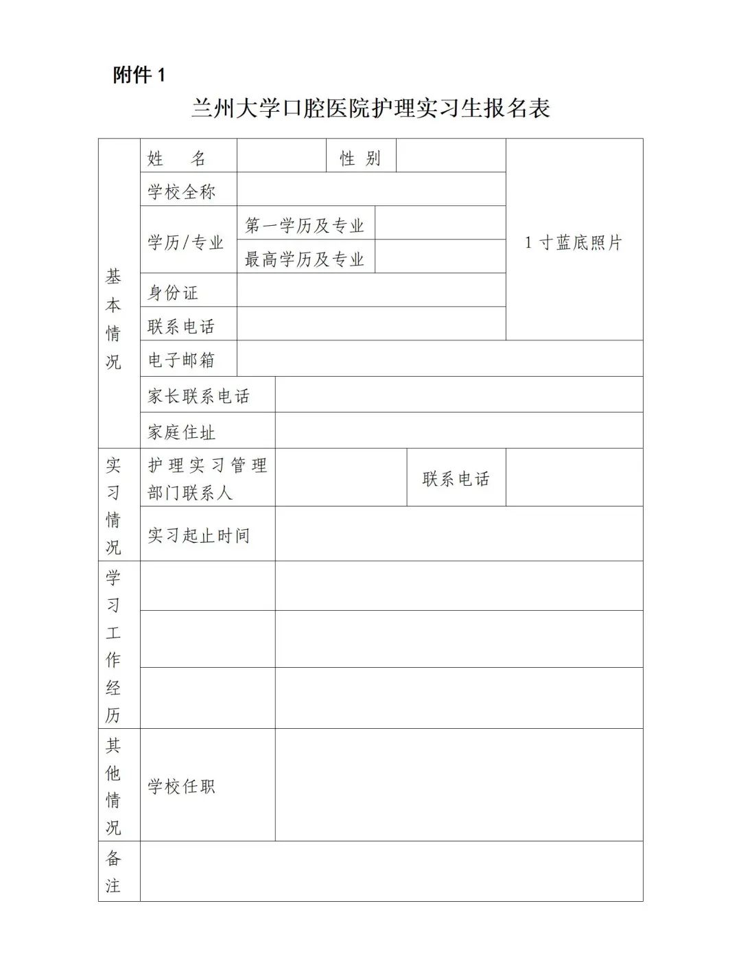| 兰州大学口腔医院是一所集医疗、教学、科研、预防保健为一体的三级甲等口腔专科医院,是甘肃省首家国家医师资格考试实践技能考试与考官培训基地(口腔类别)、国家住院医师规范化培训基地、甘肃省口腔专业质控中心、甘肃省口腔疾病临床医学研究中心、甘肃省紧密型口腔医学专科联盟、甘肃省口腔医学实验示范教学中心、甘肃省虚拟仿真实验教学示范中心、甘肃省干部口腔保健基地医院。    医院目前开设了正畸儿牙矫治中心、牙周种植护理中心、牙体修复显微中心、外科手麻舒适中心、医辅与药剂中心及西站门诊部,共计设有九个护理单元,拥有一支高学历、富有临床经验的人才队伍,现有教职工及医护人员280人,医疗技术人员216人,其中教授14人、主任医师15人,副教授16人,副主任医师15人;具有博士学位者26人,硕士学位者127人。已开展龋病及非龋性疾病治疗,牙周粘膜病的系统治疗、儿童口腔疾病治疗、心电监护拔牙和微创拔牙,牙列缺损及牙列缺失等复杂义齿修复、牙颌面畸形综合矫治技术、口腔颌面部的整形美容、人工种植牙等技术,均处于国内先进、甘肃省领先水平。现根据医院发展需要,拟在全国高水平院校招收2024年护理专业全日制护理本科实习生(口腔护理专业学历可适当放宽),相关事宜如下:    1.国家统招全日制本科学历(口腔护理专业学历可适当放宽);    2.政治思想端正、身心健康,能胜任临床护理实习工作;    3.符合条件1、2并自行联系我院进行实习的护理人员;    4.护理基础理论知识扎实,有英语四、六级证书者优先。    报名回执:医院收到报名相关信息后,将在当月的30号以邮件的形式发送报名回执(节假日顺延),确定录取名单。    1.填写《兰州大学口腔医院护理实习生报名表》(附件1)以护理实习生+姓名+学校+手机号命名后发送至兰州大学口腔医院护理部指定邮箱 lzdxkqyyhlb@163.com。    2.咨询电话:13609317616(护理部张老师、梁老师)    实习费用规定为本科生800元/人,实习期间食宿自行安排,费用自理。成绩优异者,经护理部鉴定,可免除实习费。    附件:兰州大学口腔医院护理实习生报名表【阅读原文下载附件】