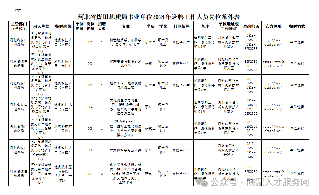 附件:1.河北省煤田地质局事业单位2024年选聘工作人员岗位条件表