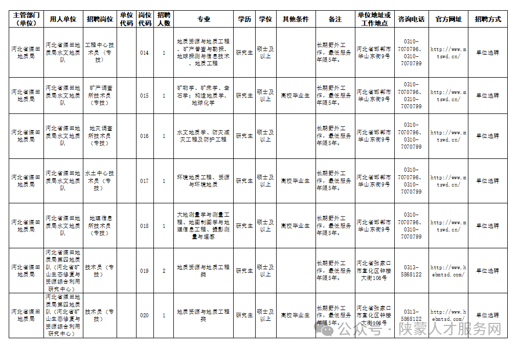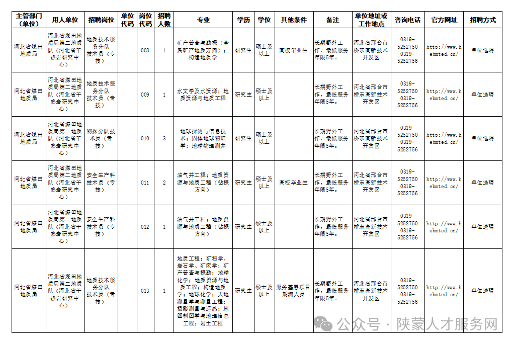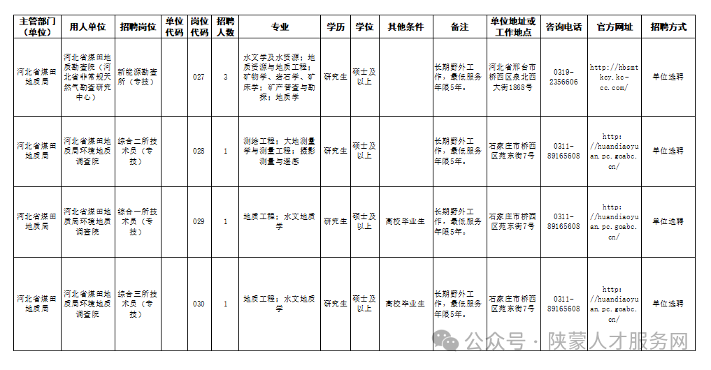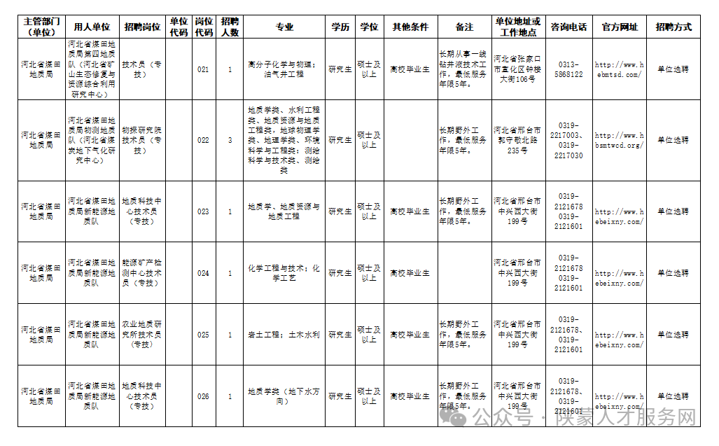 在河北人社网(https://rst.hebei.gov.cn/)、省煤田地质局网站(http://www.hebmt.gov.cn)面向社会公开发布招聘信息。根据实际情况,由招聘单位在相关高校或媒体、目标单位等宣传招聘信息,到开设相关专业的高校或目标单位参加双选会等方式开展。