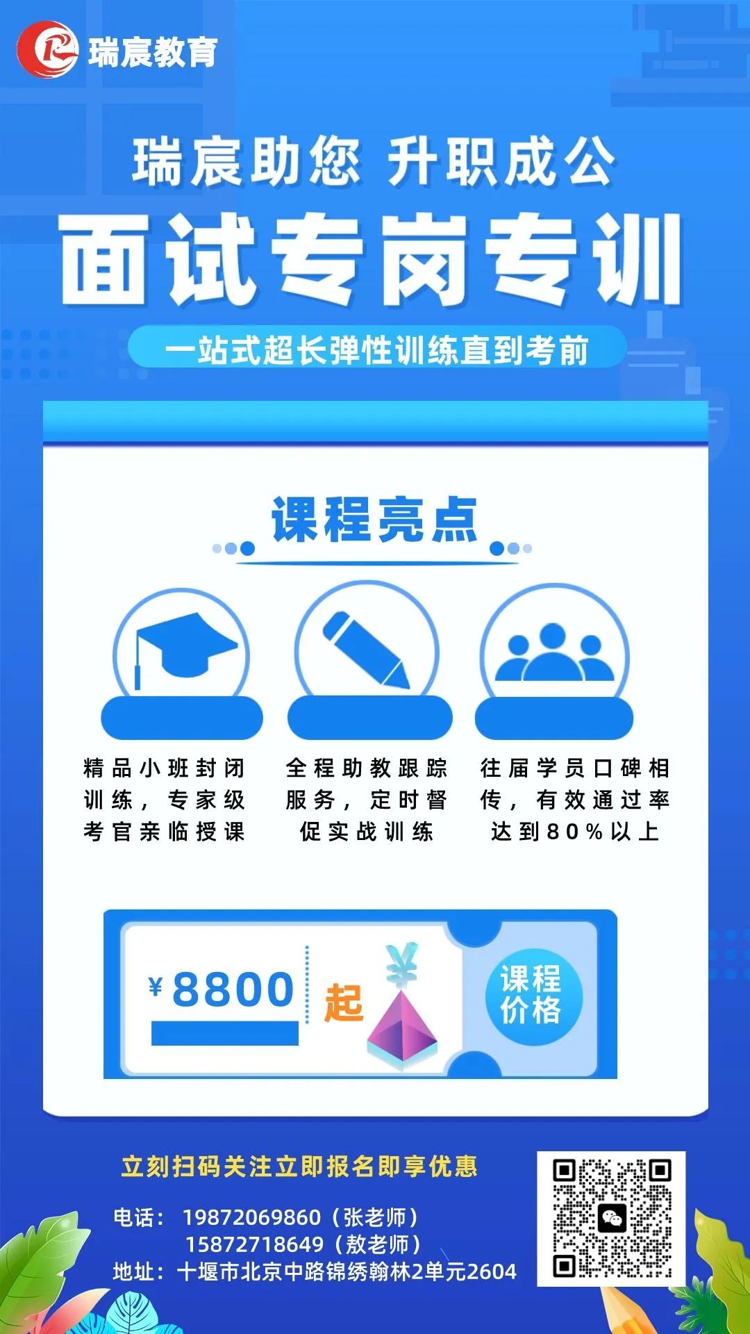 十堰瑞宸教育是一家十堰本地专注各种教师考编培训、公务员公考培训、事业单位遴选培训的专业性职业培训机构。将为您免费分析岗位特点,指导适合您的报考岗位,免去您的后顾之忧。笔试缩招如此严重,如果您能顺利进面的话,不要太幸运哦!接下来的面试对您来说可就尤为重要啦!