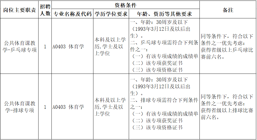![]() ![]() 报名材料: (1)《珠海城市职业技术学院合同聘用制教师招聘报名表》可编辑版及承诺人签字版扫描件(附表2); (2)《珠海城市职业技术学院合同聘用制教师应聘人员信息登记表》(附表3)可编辑版; (3)有效身份证正反面扫描件; (4)2024年应届毕业生,提供已盖公章的《毕业生就业推荐表》及学习成绩单扫描件;往届毕业生,提供各学历层次学历学位证书扫描件;以国(境)外学历学位报考的,报考时须提供教育部中国留学服务中心出具的国(境)外学历学位认证书等材料扫描件; (5)乒乓球或排球专项佐证材料扫描件(有该专项成绩的成绩单或该专项获奖证书或该专项资格证书)。 (二)资格审核 学校对考生报名材料进行资格初审后在学校网站(https://www.zhcpt.edu.cn/) 公布进入面谈人员名单及面谈事项,请考生主动关注和查询,不再另行通知考生。 (三)面谈 通过线上面谈方式,按1:3的比例确定入围现场资格复审人选,若某岗位通过面谈的人数少于该比例的,则以实际符合条件人员为现场资格复审人选。通过现场资格复审者方可进行面试。入围现场资格复审人选及考试通知在学校网站 (https://www.zhcpt.edu.cn/) 公布,请考生主动关注和查询,不再另行通知考生。 (四)考试 本次考试采取面试方式进行,主要测试考生的综合素质和专业能力等方面的能力。面试包括专业测试和综合能力测试。 专业测试包括试讲和专业技能测试(满分100分,合格线80分)。 综合能力测试实行一票否决制,综合能力测试不合格者,面试不合格。 考试时间及地点另行通知。 点击上方卡片或 长按识别二维码关注我们
