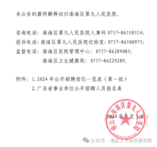2024年南海区第九人民医院招聘事业聘用制(编制)工作人员公告(第一批).pdf 附件1:2024年公开招聘岗位一览表(第一批).xls 附件2:广东省事业单位公开招聘人员报名表(3).doc 湾区人才 人才就是未来 人才测评、人才配置、 人才发展与培训 欢迎扫码咨询陈老师 👇👇👇 ![]() 事编公编企业招聘全指导 皇冠定制