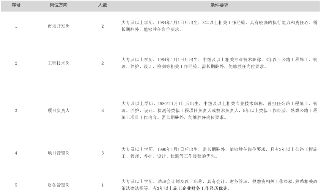 河北高速公路开发(集团)有限公司所属企业人员招聘11人的公告河北高速公路开发(集团)有限公司(简称“高开集团”)于2023年12月28日挂牌成立,是河北交通投资集团有限公司全资子公司,业务涵盖高速公路运营收费、监控指挥、道路(机电)养护及路衍产业开发。目前统筹管理保津、邢临、张石等19个运营管理单位、30条路段、3207公里高速公路(其中车道累计里程达1.5万公里),资产达2940亿元;沿线共有收费站210个、养护工区53个、监控信息中心26个,员工9000余人。为贯彻落实交投集团“十四五”规划中提出的“一体两翼、六驱、五化”发展战略,快速适应养护行业未来发展需要,按照交投集团有关要求,高开集团谋划组建全资子公司养护科技公司,做大做强专业养护业务,助力养护质量及效率迈上新台阶。点击查看更多招聘信息 养护科技公司未来将以公路专项养护工程业务为主,日常养护为辅,开展养护科技产业研发,深入探索智慧养护、绿色养护,打造“专精特新”小巨人企业。“两年上台阶,五年强实力”,初期积极参与高速公路专项养护项目,开展新型灌封料研发及应用、路面就地冷再生等业务,拓展智慧巡检、轻量化检测等高新精尖技术产业,五年内发展成为省内一流的工程养护专业公司。 一、招聘原则 坚持德才兼备、公平公正、竞争择优、依法依规原则,实行公开招聘。 二、基本条件 (一)具有中华人民共和国国籍,遵纪守法,品行端正。 (二)拥护中国共产党的领导,认真贯彻党的路线方针,思想政治素质好,责任心强,具有良好的道德品质和职业操守。 (三)身体健康,具有正常履行岗位职责的身体条件,符合《国家公务员录取体检通用标准》。 (四)认同并自觉遵守集团企业文化和核心人才理念,具有事业心和创业热忱,服从公司的岗位安排和调整。 三、岗位条件 本次面向交投集团系统招聘工作人员11人,岗位类别包括:市场开发、工程技术、财务管理、项目负责人、项目管理等。点击查看更多招聘信息 注:以上拟招聘人员如持有公路、市政等相关专业一级(二级)注册建造师、一级(二级)造价工程等职业资格证书、交安(B)(C)证书的优先予以录用,经验特别丰富的可适当放宽。 四、选聘流程 (一)报名时间 2024年3月12日至2024年3月18日17:30。 (二)报名方式 报名人员填写《河北高速公路开发(集团)有限公司所属企业工作人员报名表》,经所在单位审核盖章、本人确认签字后,将扫描件及学历学位证书扫描件、职业资格证书等岗位要求的佐证材料一并压缩后发送至指定邮箱(邮件主题备注:拟报岗位+所在单位+姓名+电话),不得重复投递简历。邮箱地址:hbgk_hr@163.com。 (三)资格审查 按照选聘条件,对应聘者的基本情况和报名材料进行资格审查,不符合选聘条件的取消应聘资格。资格审查时,应聘者须将本人身份证、学历学位证书、学信网认证资料、专业技术资格证书、执业资格证书等文件电子版与简历一同发送至指定邮箱接受审核。点击查看更多招聘信息 (四)招聘程序 简历筛选、材料核查、面试、体检、公示、录用。 五、注意事项 (一)选聘期间,工作人员将通过电话方式通知入选人员进入后续环节,未入围者不再另行通知。请正确填写电话号码,并保持通讯畅通。 (二)应聘人员应当对本人提供的信息和材料的真实性负责,对提供虛假报名信息或通过弄虛作假、伪造、编造有关证件、证明、档案及其它材料骗取应聘资格的,或在面试、体检等环节中舞弊、欺骗组织的,一经核实,取消录用资格、解除劳动合同。 六、联系方式 报名咨询电话:0311-67798135(请在工作日时间段联系)点击查看更多招聘信息 报名咨询时间:工作日上午09:00-12:00,下午14:00-18:00 河北高速公路开发(集团)有限公司 2024年3月12日 |