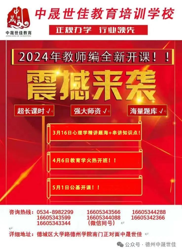中晟世佳24年教师编笔试刷题课程3月16日开课啦!优秀师资安排!欢迎大家试听对比! 另有国开、函授专科本科各学校招生报名开始了!12年德州办学经验,5000多人见证,师资专注教师编招考,高通过率,老学员自发推荐的一家教育机构。 报名地址:德州学院南门对面中晟世佳 联系电话:0534-8982299,16605343566,16605344088,16605342366,16605343599,16605343344 |