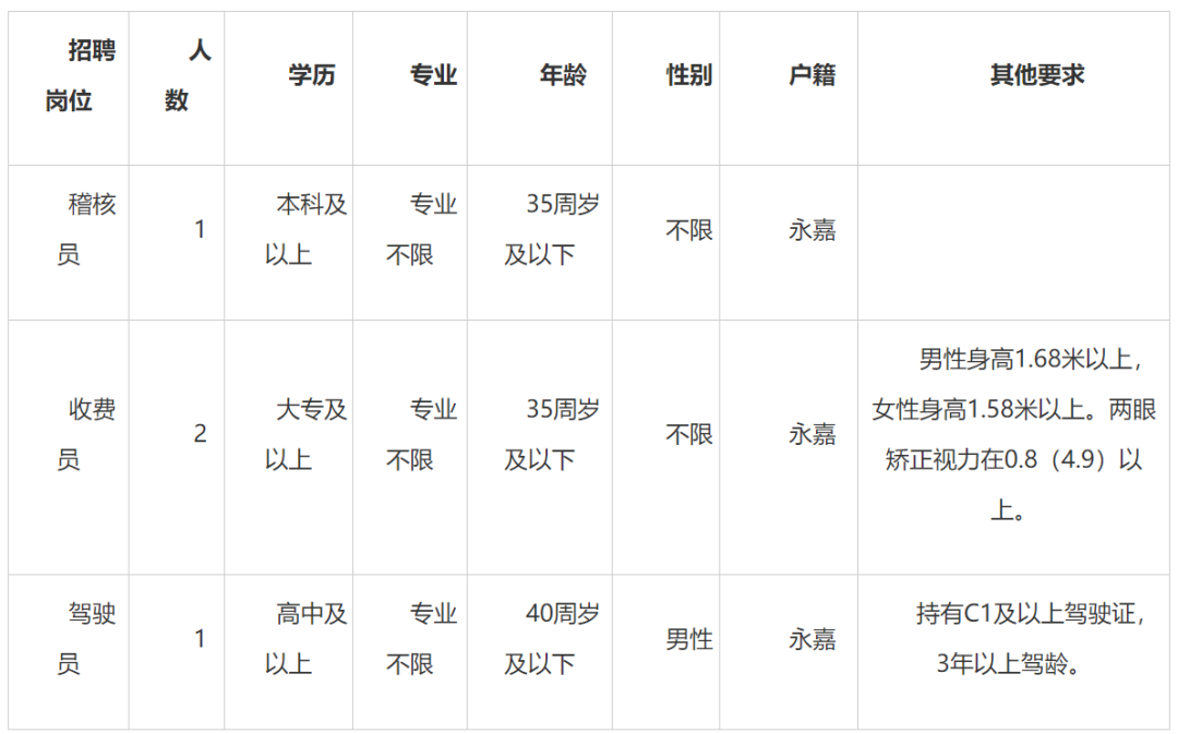 三、报名 (一)报名材料 1.身份证、户口簿或户籍证明、公安机关出具的无违法犯罪记录证明、毕业证书(原件、复印件各1份)。 2.单寸近期免冠照片3张。 3.报名表:从本公告附件下载。 (二)报名时间:2024年3月11日—3月18日(上午8:30—11:30,下午2:30—5:00,休息日除外)。 (三)报名地点:温州北收费站管理中心三楼306室(永嘉县三江街道罗溪村)。 (四)报名人员须本人到现场报名,要对自己提供的材料的真实性负责。工作人员对报名人员所提交的材料信息进行接收、资格审查及身高视力初测。凡弄虚作假者,一经查实,取消其报名资格。