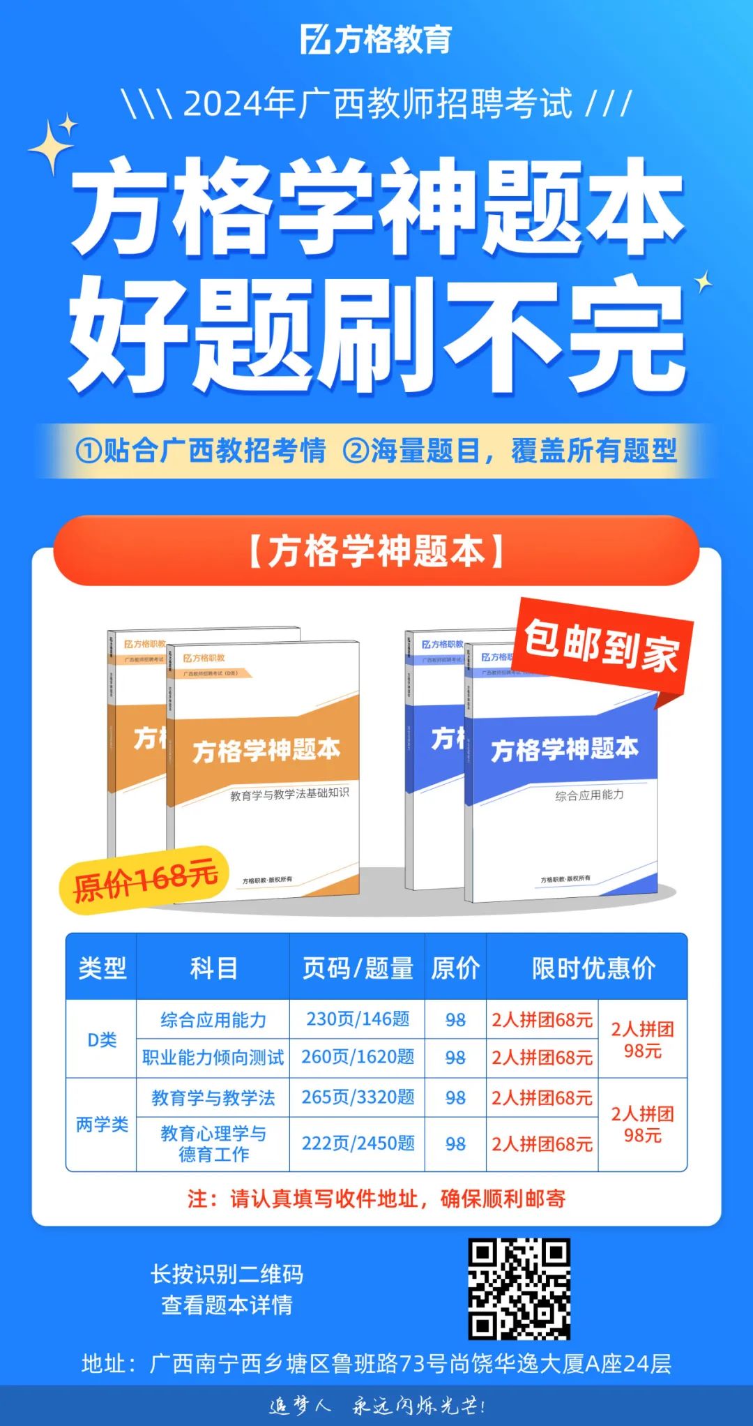 隆安县2024年公开招聘急需紧缺教师工作领导小组办公室 2024年3月12日 关注公众号并回复“隆安12” 获取岗位表 刷题必备——方格学神题本 好题刷不完,好题当书看 💛超厚题本,上千道精选题目等你战 💛超详解析,思路清晰高效为你解惑 扫码查看详情 ![]() ![]() 超多面试资料免费领取啦~ 精品教案/说课稿 面试技巧/模板 ........... 种类丰富,回复“面试资料”领取 ![]() |