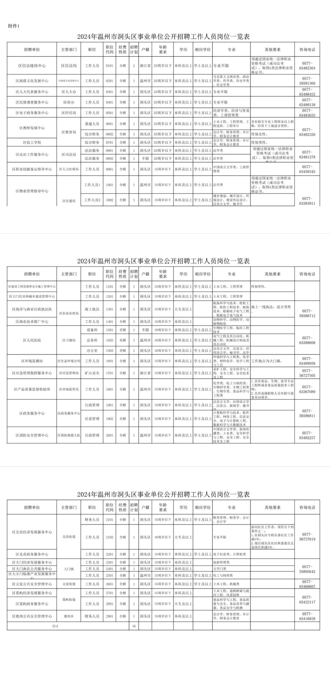 点击上方蓝字,关注我们 招聘信息 为优化事业单位人员队伍结构,满足事业单位工作需要,根据中共浙江省委组织部、浙江省人力资源和社会保障厅《关于进一步加强事业单位公开招聘工作的指导意见》(浙人社发〔2012〕194号)精神,经研究,决定开展2024年温州市洞头区事业单位公开招聘工作人员工作。现将有关事项公告如下: 01 招聘对象基本条件 1.具有中华人民共和国国籍; 2.具有良好的政治素质,爱国守法,品行端正; 3.具有岗位所需的学历、专业; 4.具有适应岗位要求的身体条件、年龄要求(30周岁1994年3月21日及以后出生,35周岁1989年3月21日及以后出生,40周岁1984年3月21日及以后出生); 5.具有岗位所需的其他条件。 02 招聘单位、具体岗位和要求 1.招聘单位、具体岗位和要求详见《2024年温州市洞头区事业单位公开招聘工作人员岗位一览表》(附件1)。 2.凡报名资格条件中涉及时间计算的统一截止到2024年3月25日。 3.户籍要求为“浙江省”的岗位,可报考的对象为:浙江省各县(市、区)户籍的人员、浙江生源全日制普通高校2024年应届毕业生。户籍要求为“温州市”的岗位,可报考的对象为:温州市各县(市、区)户籍的人员、温州生源全日制普通高校2024年应届毕业生。户籍要求为“洞头区”的岗位,可报考的对象为:洞头区户籍的人员、洞头生源全日制普通高校2024年应届毕业生、父母一方或配偶具有洞头户籍的人员(以2024年3月20日的户口所在地及法定婚姻关系为准)。 4.面向社区工作者岗位(职位代码:2102)招聘对象为:现任洞头区专职社区工作者且在洞头区专职从事社区工作满3年,或现任洞头区社区两委委员且连续任职满3年。 5.学历、学位以国家教育行政机关认可的相应证件文书为准。招考专业由招聘单位及其上级主管部门参考《2024年浙江省公务员录用考试专业参考目录》及高校专业设置目录审查认定。高校专业设置目录,大学专科专业参考《普通高等学校高等职业教育(专科)专业目录(2015年)》、《职业教育专业目录(2021年)》;大学本科专业参考《普通高等学校本科专业目录(2020年)》;研究生专业参考《授予博士、硕士学位和培养研究生的学科、专业目录》(2008更新版)、《学位授予和人才培养学科目录(2018年4月更新)》及《各专业学位类别的领域设置情况》。 03 招聘程序 按照“公开、平等、竞争、择优”的原则,通过公开报名、统一考试、严格考核、择优聘用的方式进行。 (一)报名和资格初审 报名时间:2024年3月21日9时—3月25日17时 资格初审时间:2024年3月21日9时—3月26日17时 报考人员登录“浙江省通用招聘网报平台”(网址:http://qssy.zjks.com),按岗位要求和网报平台提示,如实、准确、完整地填写有关信息,选择岗位进行报名。 报名后由招聘单位对报考人员是否符合职位资格条件进行初审。通过资格初审的不能再报考其他岗位;未通过的可在报名时间内再次报名并接受资格初审。 洞头区在职公务员、全额事业人员、机关工勤人员不得报考。 资格审查贯穿招聘全过程,报考人员填写的报考信息必须真实、准确、有效。凡提供虚假信息和材料获取报考资格的,或有意隐瞒本人真实情况的,一经查实,即取消招聘资格。请考生自报名之日起到招聘工作结束,确保报名填写的手机号码畅通,如有更改,及时告知招聘单位。 (二)缴费确认 时间:3月26日17时—3月29日17时 通过资格初审的人员登录网上报名系统,进行缴费确认并查询是否完成。未按时缴费确认的,视为放弃报考。 根据浙江省物价局、浙江省财政厅《关于调整我省公务员录用和事业单位公开招聘人员考试费收费的复函》(浙价费〔2018〕21号)文件规定,每科考试费为50元。困难家庭的报考人员请于3月27日12时前将本人身份证及所在县级民政(扶贫)部门出具的低保证或特困证明复印件传真至0577-56723805,经审核后免除其考试费。 同一岗位的招聘计划数与缴费确认人数达不到1:3的,将相应核减或取消招聘计划,并在洞头区政府网(网址:http://www.dongtou.gov.cn)公布。招聘计划取消的,报名该岗位并缴费确认的考生,自接到通知起24小时内依据通知要求改报其他符合报考条件的岗位;因报考人员自身原因,无法正常联络或接到通知后逾期未改报的,视作放弃报考,退还考试费。 (三)下载并打印《笔试准考证》 时间:4月23日9时—4月27日14时30分 已完成缴费确认的人员,须在规定时间内登录网报平台,自行下载打印《笔试准考证》。 因逾期打印准考证而影响参加考试的责任,由考生自负。 (四)笔试 4月27日 上午 9:00—11:30 《综合应用能力》 下午 14:00—15:30 《职业能力倾向测验》 报考人员必须同时携带《笔试准考证》、身份证,按照规定的时间和地点参加考试。 笔试总成绩=《综合应用能力》×50%+《职业能力倾向测验》×50%。报考人员必须参加两科考试,否则笔试成绩无效。 根据报考人员笔试总成绩,从高分到低分按1:3的比例确定拟面试对象,如遇最后一名同分的,一并列为拟面试对象。 (五)资格复审 1.资格复审仅对列为拟面试对象的报考人员进行,具体时间、地点另行通知。请密切关注洞头区政府网相关信息。 2.资格复审时,考生应提供本人身份证、户口簿、毕业证书、学位证书以及其他报考岗位所需的证件(证明)原件及复印件。2024年普通高校应届毕业生尚未取得毕业证书的,还应提供学校核发的就业推荐表、教育部学生