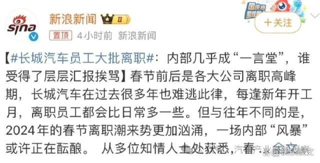 近日,长城汽车员工大批离职的消息震惊了整个汽车行业。春节前后,各大公司开启了离职潮,长城汽车也未能幸免。每到春节开工季,离职的员工都比日常的要多。