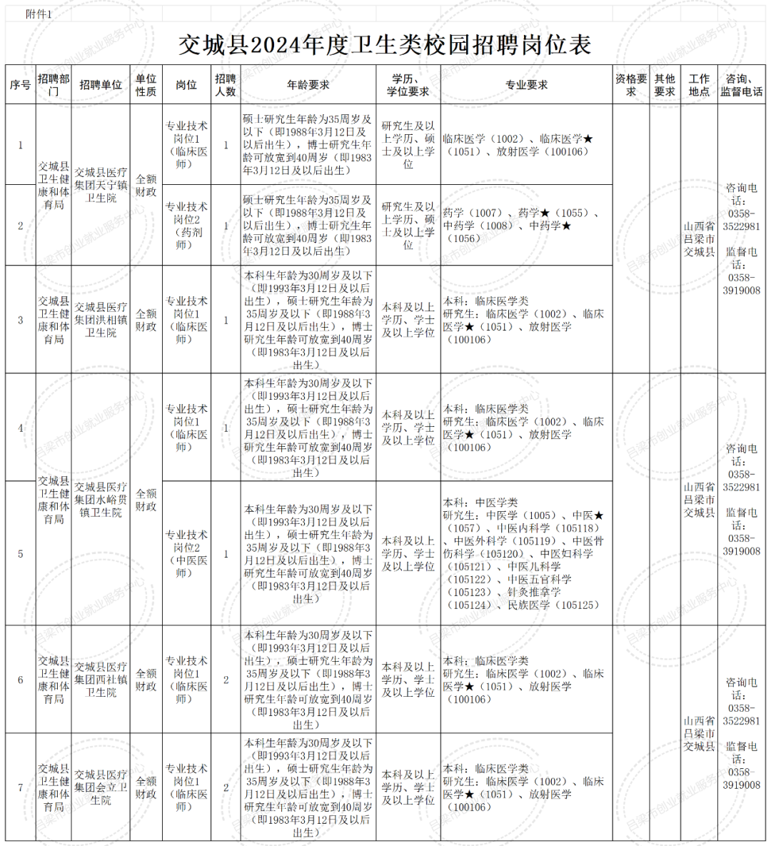 (一)报名与资格审查 1.报名方式及时间 报名时间:2024年3月21日—3月23日 上午:08:30-12:00 下午15:00-18:00 报名方式:本次校园招聘采取现场报名的方式进行,招聘会场设立在长治医学院。 报名地点:长治医学院校本部(北区)至善楼A座107室 报考人员须在规定时间、规定地点,提交《交城县2024年度卫生类校园招聘报名登记表》(以下简称《报名登记表》)。 报考人员只能选择一个岗位进行报名,报名与考试时使用的本人有效居民身份证必须一致。报名时,报考人员须认真填写《报名登记表》并签订诚信承诺书,确保提交的报名信息真实、准确、完整(《报名登记表》中所填写的专业应当与报考者本人取得高校毕业证上所载明的专业一致。如毕业学校按照一级学科发放毕业证的,须如实填写毕业证所载一级学科名称,《报名登记表》“备注”栏中写明所学具体专业;取得国(境)外学历学位的报考人员须在《报名登记表》“备注”栏中写明所学核心课程和毕业论文题目,并由交城县2024年度卫生类校园招聘工作领导组组织5名本专业或相近专业专家对其专业是否符合岗位要求进行认定)。 提供虚假报名信息的,一经查实,立即取消报考资格。对伪造、变造有关证件、材料、信息骗取考试资格的,将按《事业单位公开招聘违纪违规行为处理规定》(人社部35号令)予以严肃处理。凡因信息填报有误、不全等导致未通过资格审查的,后果由报名者自负。 2.资格审查 时间:报名同时进行现场资格审查 资格审查时,应聘人员应提供下述所需材料: (1)《报名登记表》(一式三份,照片需本人近一年内2寸红底免冠正面照,并在本人承诺部分签字); (2)本人有效居民身份证、户口簿(首页及本人页)原件及复印件(一式三份); (3)本人近一年内2寸红底免冠正面照片3张; (4)毕业证、学位证原件及复印件(一式三份); (5)通过学信网下载的《教育部学历证书电子注册备案表》学历证明及《中国高等教育学位在线验证报告》学位证明;留学人员应提供教育部留学服务中心出具的国(境)外学历、学位认证书; (6)毕业院校按照一级学科发放毕业证的,需提供学校出具的专业证明及在校成绩单原件及复印件。 (7)审查时暂未取得相应学历和学位证书的2024年应届毕业生,需提供所在学院或学校出具的学历学位证明,说明入学及毕业时间、所学专业、学位类型(注明学术型硕士或专业型硕士)、是否可如期毕业及按期取得学历、学位证书,并在2024年8月31日前取得相应的学历和学位证书;提供通过学信网下载的《教育部学籍证书电子注册备案表》。 (8)按报名岗位需求,提供相关资格证件及证明。 证件(证明)不全或所提供的证件(证明)与所报岗位资格条件不符以及主要信息不实,影响资格审查的,取消该报考人员参加面试资格。报考人员未按规定时间、地点参加资格审查的,视为自动放弃面试资格。 资格审查贯穿本次校园招聘工作全过程,在任何环节发现不符合岗位报名要求的考生,立即取消其考试资格。 3.核减、取消岗位 实际报名人数不达岗位招聘人数的岗位,按1:1核减岗位招聘人数,如减少到1个仍无人报考,原则上予以取消。岗位被核减、取消或调整的,经核准后在原发布校园招聘公告的网站发布通知。 4.下载打印《笔试准考证》 报考人员在报名结束后,可于指定时间登录网站自行下载打印《笔试准考证》。下载打印过程中如遇问题请与交城县2024年度卫生类校园招聘工作领导组办公室联系解决。 报考人员应认真阅读准考证相关内容及注意事项,提前做好考试准备,并妥善保管好自己的准考证,以备笔试及本次校园招聘其他环节使用。 (二)考试 (1)岗位招聘条件为本科及以上学历、学士及以上学位采取笔试与面试相结合的办法确定引进人选,综合成绩=笔试成绩×60%+面试成绩×40%。笔试、面试成绩保留两位小数,综合成绩保留三位小数(尾数四舍五入)。 (2)岗位招聘条件为硕士研究生及以上学历、学位要求的,岗位实际报名人数与招聘人数比例小于5:1,只进行面试。成绩采取百分制,面试成绩保留两位小数(面试成绩即为综合成绩)。岗位实际报名人数与招聘人数比例大于或等于5:1,则增加笔试环节,成绩采取百分制,综合成绩=笔试成绩×60%+面试成绩×40%。笔试、面试成绩保留两位小数,综合成绩保留三位小数(尾数四舍五入)。 1.笔试 笔试工作由交城县2024年度卫生类校园招聘工作领导组委托第三方专业机构组织实施。 笔试时间、地点:以《笔试准考证》为准 笔试范围: (1)岗位招聘条件为本科及以上学历、学士及以上学位的通过资格审查人员。 (2)岗位招聘条件为硕士研究生及以上学历、学位要求的,且实际报名人数与招聘人数比例大于或等于5:1的通过资格审查人员。 笔试内容:均为医学基础知识及专业学科知识。 考试时间120分钟,满分100分。笔试成绩保留两位小数。笔试最低合格分数线为60分(含60分)。 参加考试时,考生须同时持有《笔试准考证》和与报名时一致的本人有效居民身份证,两证不全的不得参加考试。身份证过期、丢失的请及时到公安机关办理临时身份证。 2.面试 面试对象: (1)岗位招聘条件为本科及以上学历、学士及以上学位,从笔试成绩达到60分及以上的考生中,依据从高分到低分的顺序,按计划招聘人数3倍的比例确定参加面试的人选,末位成绩并列的人员一并进入面试;人数未达3:1的按实有人数确定