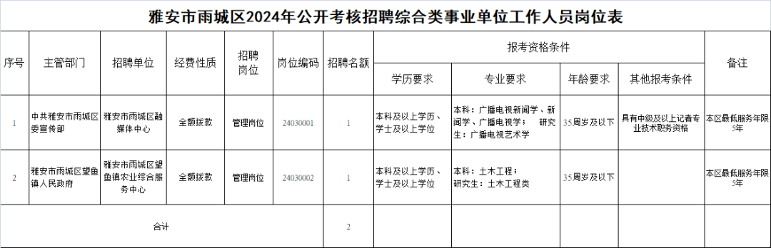 本次公开考核招聘综合类事业单位工作人员共计2名,具体招聘单位、岗位、名额及报考资格条件详见《雅安市雨城区2024年公开考核招聘综合类事业单位工作人员岗位表》(附件1)。