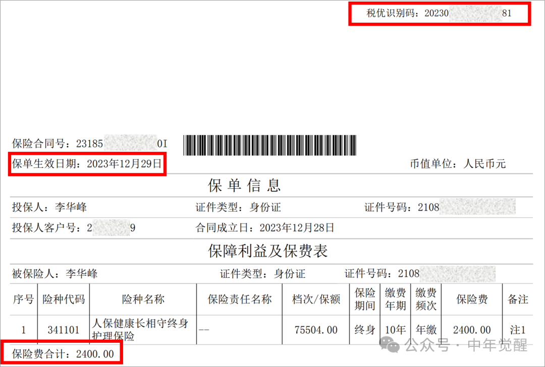 2. 年度保费按保单上实际金额填写,扣除金额在实际保费和2400两者间取较大值。