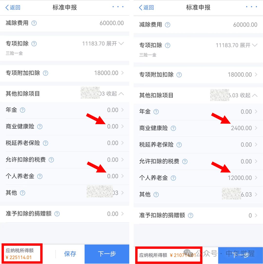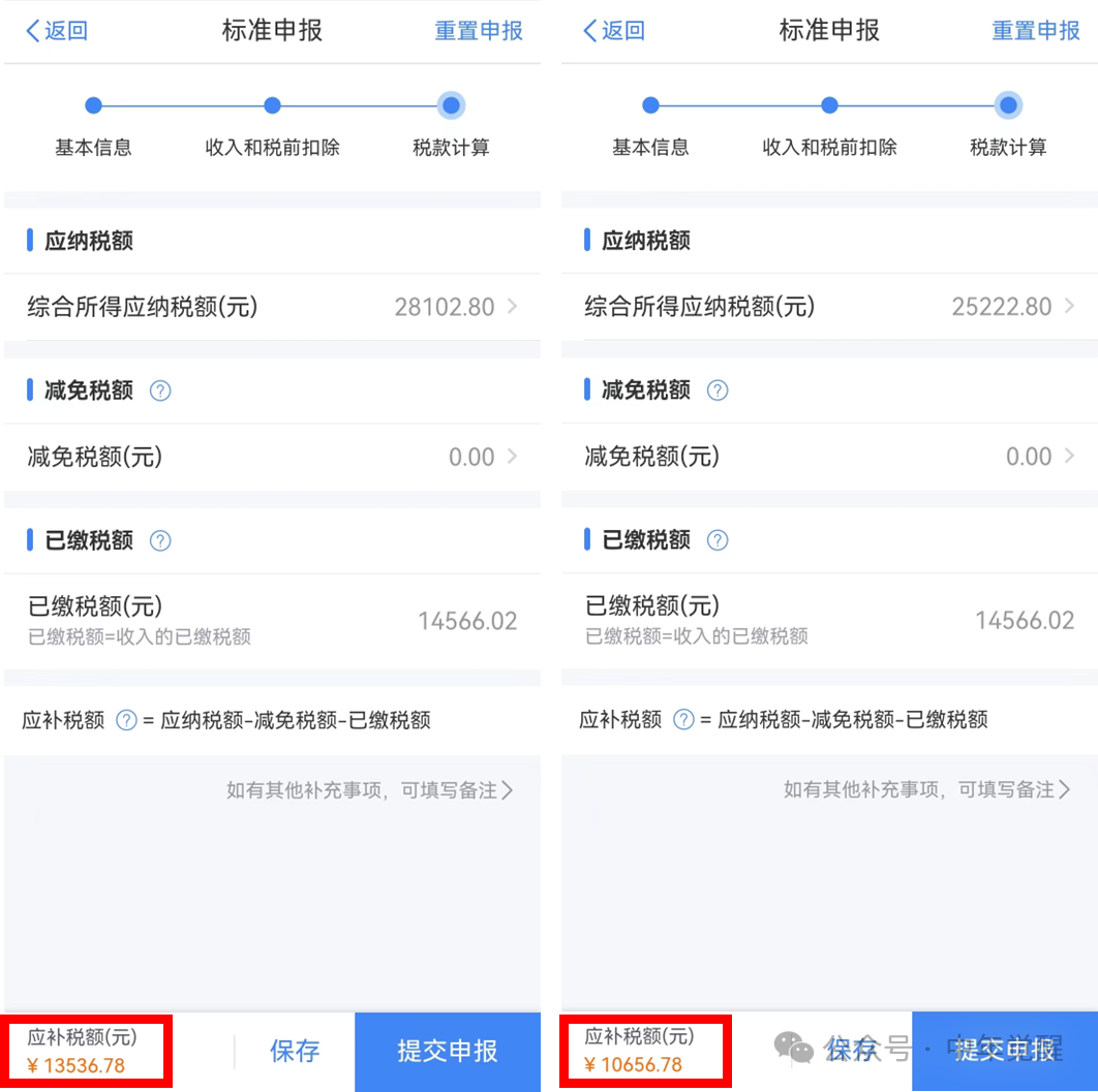 虽然还是要补税,但对比这两项填报前后,可以少补接近3000块钱,还是很值得的。