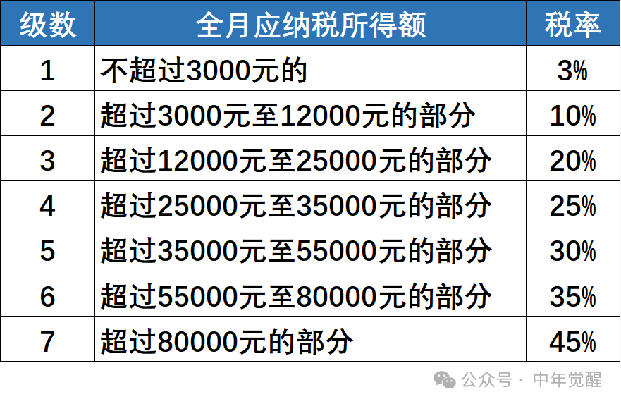 单独计税的规则是:将这一笔奖金金额÷12,按月换算,然后按照下表的税率来超额累进。