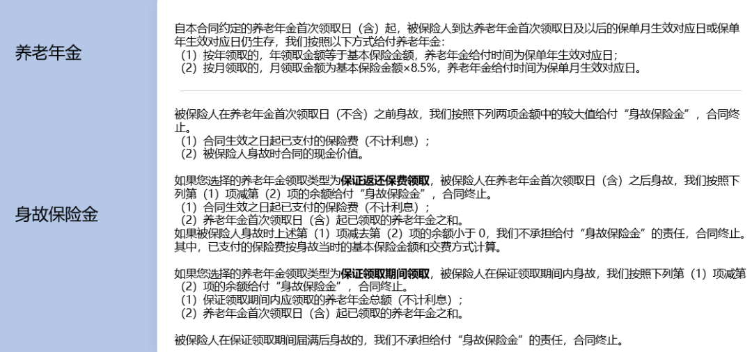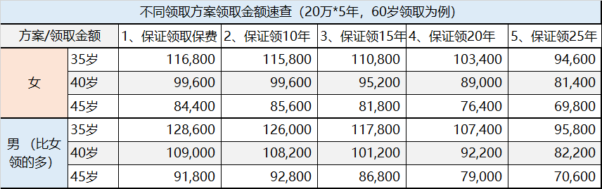6、领取方案:5种方案,保证返还保费,保证10/15/20/25年领取(开始领取后现价为0,或保证领取后现价为0)