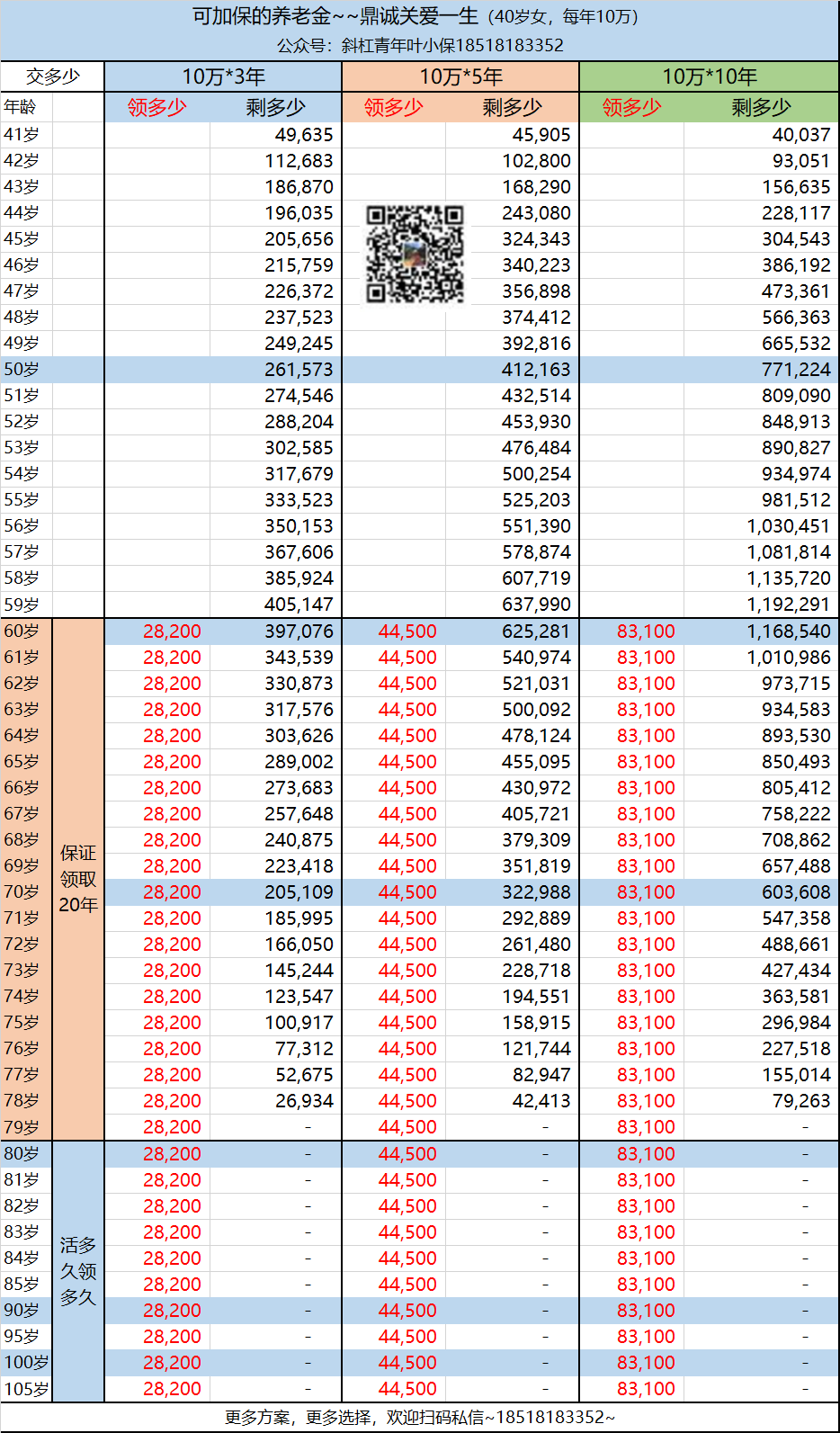 二、40岁女的几种方案(更多方案,私信我年龄性别、预算、交费期,领取年龄,可做计划书和对比方案,+V:18518183352)