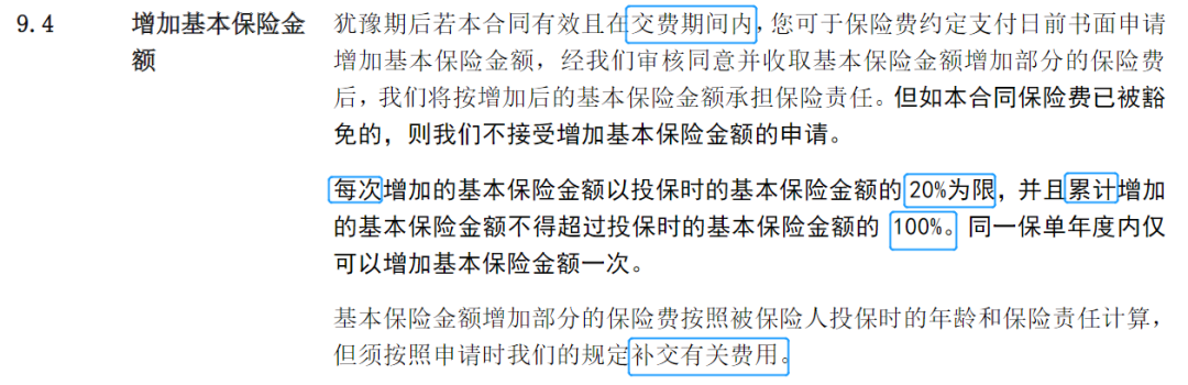 8、加保:交费期内可加保;每次/年可增加20%,累计可增加投保时的基本保额的100%