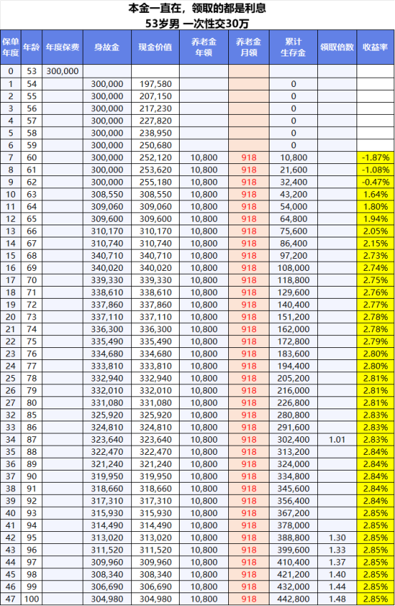 四、方案四:本金一直在,领取都是利息的养老金方案