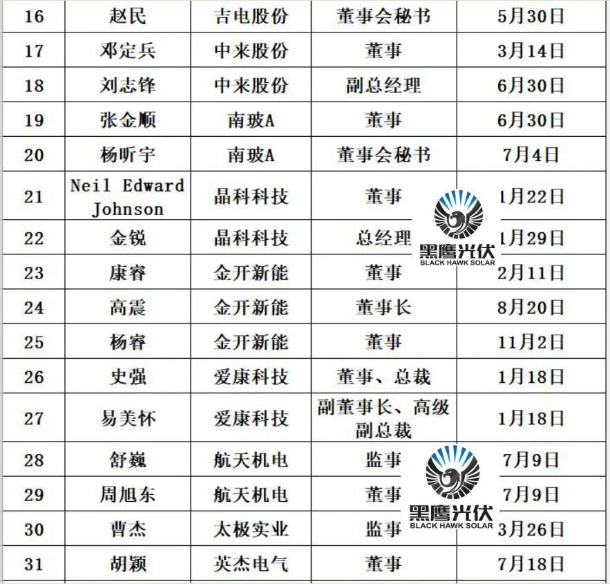参考世纪新能源网的统计,岁末年初至今,已有10家光伏企业超20位高管发布人事变动公告。比如,爱康科技多个高级管理人员变更;易成新能总裁曹德彧辞职;光伏跨界企业麦迪科技副总经理辞职;横店东磁总经理发生了变更;光伏电池“新势力”赛福天董事辞职;光伏新秀聆达集团副总裁换人,等等——熙熙攘攘,络绎不绝。